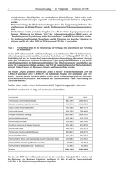 20. Wahlperiode Drucksache 20/1326 HESSISCHER LANDTAG 08. 01. 2020 Kleine Anfrage Dr. Daniela Sommer (SPD) vom 08.10.2019 Digitalisierung an hessischen Hochschulen – Teil I und Antwort Ministerin für Wissenschaft und Kunst Vorbemerkung Fragestellerin: Hochschulen fehlt es oftmals nicht an digitalen Lehr- und Lerninnovationen, sondern an struktureller und strategischer Verbreitung. Der Erfolg der Digitalisierung beruht auf der Strategie. Digitalisierung sollte über den Fokus einzelner Projekte hinausgehen. Es geht vielmehr um konzeptionell und strategisch Überlegungen, bei denen die prozessualen, organisatorischen und IT-technischen Weichen gestellt werden. Vorbemerkung Ministerin für Wissenschaft und Kunst: Im Bereich digitaler Infrastrukturen und des Informationsmanagements stellen die Landesregie- rung und die Hochschulen im Rahmen der Landeshochschulentwicklungsplanung seit 2010 ge- meinsam strategische Überlegungen an, stimmen Ziele aufeinander ab und setzen entsprechende Vorhaben um. Ergebnisse dessen sind u.a. das 2012 ausgearbeitete Positionspapier „Die Zu- kunft der wissenschaftlichen Infrastruktur in Hessen bis 2020“ und acht im Rahmen des Hessi- schen Hochschulpakts 2016 bis 2020 hochschulübergreifend durchgeführte Digitalisierungspro- jekte. Mit dem Verbundprojekt „Digital-gestütztes Lehren und Lernen in Hessen“ (DigLL) wurde die Kooperation 2018 auf die digitale Unterstützung der Hochschullehre ausgeweitet. Die Planungen für die kommenden Jahre, insbesondere im Digitalpakt Hochschulen, bauen auf die- ser Grundlage auf. Diese Vorbemerkung vorangestellt, beantworte ich die Kleine Anfrage im Einvernehmen mit der Ministerin für Digitale Strategie und Entwicklung wie folgt: Frage 1. Inwiefern plant die Landesregierung analog des Digitalpakts Schule einen Digitalpakt für Hoch- schulen mit welchen Rahmenbedingungen und Zielen? Die Landesregierung wird den digitalen Wandel in Forschung und Lehre an den hessischen Hochschulen mit einem „Hessischen Digitalpakt Hochschulen“ unter strategischen Gesichts- punkten vorantreiben. Der Pakt soll in den Hochschulen den Aufbau strategischer Strukturen bewirken, den finanziellen Rahmen von Digitalisierungsmaßnahmen für die kommenden Jahre bestimmen, Referenzrahmen für die durchzuführenden hochschulübergreifenden und hochschul- individuellen Maßnahmen sein und das Verfahren für die Vergabe und Verwendung der zur Verfügung stehenden Mittel festlegen. Die Inhalte des Digitalpakts werden derzeit mit den hes- sischen Hochschulen verhandelt. Vorbehaltlich der Ergebnisse dieses Prozesses sollen mit dem Digitalpakt folgende strategische Ziele verfolgt werden: Ausbau effizienter übergreifender Governance-Strukturen zur Vernetzung der inneruniversi- tären und interuniversitären Organisation und zur Unterstützung des Entwicklungsprozesses im digitalen Bereich. Unterstützung der Forschung durch den Ausbau des Open-Science-Angebots im Bereich des Forschungsdaten- und Softwaremanagements, der digitalen Sammlungen und des föderierten Hochleistungsrechnens. Ausbau des digital-gestützten Lehrens und Lernens sowie der Lernmobilität. Förderung der wissenschaftlichen Bibliotheken sowie des Hessischen Bibliotheksinforma- tionssystems durch die Einführung eines neuen Bibliothekssystems der nächsten Generation. Unterstützung von Forschung, Lehre und Verwaltung durch den weiteren Ausbau der digita- len Infrastruktur, wie beispielsweise durch hochschulweiten Zugang zu WLAN, daten- Eingegangen am 8. Januar 2020 · Bearbeitet am 8. Januar 2020 · Ausgegeben am 10. Januar 2020 Herstellung: Kanzlei des Hessischen Landtags · Postfach 3240 · 65022 Wiesbaden · www.Hessischer-Landtag.de