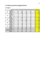 15 K. Frankfurt University of Applied Sciences zu Frage 2: Laufzeit: < 1 Monat 1-2 Monate 3-5 Monate 6-12 Monate >12 Monate Summe weiblich 0 78 26 53 0 157 ZSE männlich 0 83 30 24 0 137 Summe 0 161 56 77 0 294 weiblich 1 9 35 9 0 54 männlich 1 16 44 4 0 65 Fb1 divers 0 1 0 0 0 1 Summe 2 26 79 13 0 120 weiblich 1 10 34 10 1 56 Fb2 männlich 2 56 88 31 1 178 Summe 3 66 122 41 2 234 weiblich 4 5 23 14 0 46 Fb3 männlich 1 5 18 12 0 36 Summe 5 10 41 26 0 82 weiblich 4 23 37 32 0 96 Fb4 männlich 1 7 22 20 0 50 Summe 5 30 59 52 0 146 weiblich 10 125 155 118 1 409 Gesamte männlich 5 167 202 91 1 466 Hochschule divers 0 1 0 0 0 1 Summe 15 293 357 209 2 876