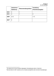 Anlage 2 Zu KA 20/5352 Islamismus/ Vorstellung Phänomenübergreifend Salafismus Präventionsangebot 2018 2 1 - 2019 3 1 4 2020 1 2 (1) - 1 (1) 2021 2 6 - - 1 Die aufgrund der Corona-Pandemie abgesagten Veranstaltungen stehen in Klammern. 2 Bei den Zahlen für 2021 handelt es sich um bereits durchgeführte oder terminierte Veranstaltungen.