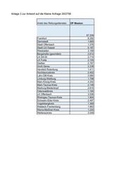 Anlage 3 zur Antwort auf die Kleine Anfrage 20/2758 Anteil des Rettungsdienstes OP Masken 67.206 Frankfurt 8.292 Darmstadt 1.665 Stadt Offenbach 1.376 Stadt /LK Kassel 6.187 Wiesbaden 3.169 Bergstraße (geschätzt) 2.612 LK DA-DI 2.714 LK Fulda 2.155 Gießen 2.767 Groß Gerau 2.238 Hersfeld Rotenburg 1.411 Hochtaunuskreis 2.402 Lahn-Dill-Kreis 2.680 Limburg-Weilburg 1.798 Main-Kinzig-Kreis 4.242 Main-Taunus-Kreis 2.148 Marburg-Biedenkopf 2.615 Odenwaldkreis 1.165 LK Offenbach 3.536 Rheingau-Taunus-Kreis 1.904 Schwalm-Eder-Kreis 2.497 Vogelsbergkreis 1.369 Waldeck-Frankenberg 1.983 Werra-Meißner-Kreis 1.220 Wetteraukreis 3.049