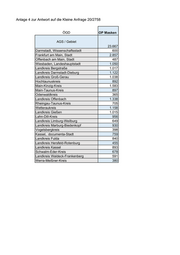 Anlage 4 zur Antwort auf die Kleine Anfrage 20/2758 ÖGD OP Masken AGS / Gebiet 23.667 Darmstadt, Wissenschaftsstadt 600 Frankfurt am Main, Stadt 2.857 Offenbach am Main, Stadt 487 Wiesbaden, Landeshauptstadt 1.050 Landkreis Bergstraße 1.017 Landkreis Darmstadt-Dieburg 1.122 Landkreis Groß-Gerau 1.038 Hochtaunuskreis 892 Main-Kinzig-Kreis 1.583 Main-Taunus-Kreis 897 Odenwaldkreis 365 Landkreis Offenbach 1.338 Rheingau-Taunus-Kreis 705 Wetteraukreis 1.158 Landkreis Gießen 1.015 Lahn-Dill-Kreis 956 Landkreis Limburg-Weilburg 649 Landkreis Marburg-Biedenkopf 930 Vogelsbergkreis 398 Kassel, documenta-Stadt 759 Landkreis Fulda 840 Landkreis Hersfeld-Rotenburg 455 Landkreis Kassel 893 Schwalm-Eder-Kreis 678 Landkreis Waldeck-Frankenberg 591 Werra-Meißner-Kreis 380