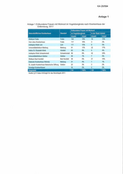 KA 20/594 Anlage 1 Anlage 1 Entbundene Frauen mit Wohnort im Vogelsbergkreis nach Krankenhaus der Entbindung, 2017 Geburtshilfliches Krankenhaus Standort im Vogelsbergkreis Anzahl Anteil ffü H m Klinikum Fulda Fulda 144 19% 16 12% Herz-Jesu-Krankenhaus Fulda 117 16% 3 2% Asklepios Klinik Lieh Lieh 111 15% 6 5% Universitätsklinikum Marburg Marburg 91 12% 22 17% Helios St. Elisabeth-Klinik Hünfeld 63 9% 5 4% Asklepios Klinik Schwalmstadt Schwalmstadt 58 8% 42 33% Universitätsklinikum Gießen Gießen 49 7% 7 5% Klinikum Bad Hersfeld Bad Hersfeld 38 5% 21 16% Diakonie-Krankenhaus Wehrda Marburg 31 4% 1 1% St.-Josefs-Krankenhaus Balserische Stiftung Gießen 23 3% 3 2% Sonstige Krankenhäuser 16 2% 3 2% Insgesamt 741 100% 129 100% Quelle: § 21 Daten KHEntgG für das Berichtsjahr 2017.