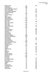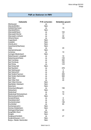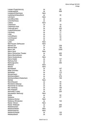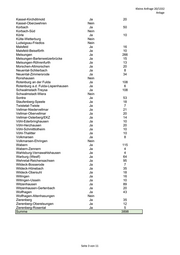 Kleine Anfrage 20/1332 Anlage Kassel-Kirchditmold Ja 20 Kassel-Oberzwehren Nein Korbach Ja 50 Korbach-Süd Nein Körle Ja 10 Külte-Wetterburg Nein Ludwigsau-Friedlos Nein Malsfeld Ja 16 Malsfeld-Beiseförth Ja 10 Melsungen Ja 266 Melsungen-Bartenwetzerbrücke Ja 15 Melsungen-Röhrenfurth Ja 13 Morschen-Altmorschen Ja 20 Neuental-Schlierbach Ja 8 Neuental-Zimmersrode Ja 34 Ronshausen Nein Rotenburg an der Fulda Ja 108 Rotenburg a.d. Fulda-Lispenhausen Ja 6 Schwalmstadt-Treysa Ja 108 Schwalmstadt-Wiera Nein Sontra Ja 53 Staufenberg-Speele Ja 18 Twistetal-Twiste Ja 7 Vellmar-Niedervellmar Ja 21 Vellmar-Obervellmar Ja 20 Vellmar-Osterberg/EKZ Ja 14 Vöhl-Ederbringhausen Ja 10 Vöhl-Herzhausen Ja 20 Vöhl-Schmittlotheim Ja 10 Vöhl-Thalitter Ja 10 Volkmarsen Ja 8 Volkmarsen-Ehringen Nein Wabern Ja 115 Wabern-Zennern Ja 4 Wahlsburg-Vernawahlshausen Ja 4 Warburg (Westf) Ja 64 Wehretal-Reichensachsen Ja 95 Wildeck-Bosserode Ja 7 Wildeck-Hönebach Ja 35 Wildeck-Obersuhl Ja 18 Willingen Ja 16 Willingen-Usseln Ja 10 Witzenhausen Ja 89 Witzenhausen-Gertenbach Ja 20 Wolfhagen Ja 43 Wolfhagen-Altenhasungen Nein Zierenberg Ja 35 Zierenberg-Oberelsungen Ja 12 Zierenberg-Rosental Ja 5 Summe 3898 Seite 3 von 11