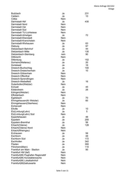 Kleine Anfrage 20/1332 Anlage Butzbach Ja 231 Caldern Ja 10 Cölbe Nein Darmstadt Hbf Ja 430 Darmstadt Nord Nein Darmstadt Ost Nein Darmstadt Süd Nein Darmstadt TU-Lichtwiese Nein Darmstadt-Arheilgen Ja 72 Darmstadt-Eberstadt Nein Darmstadt-Kranichstein Nein Darmstadt-Wixhausen Ja 63 Dieburg Ja 97 Dietzenbach Bahnhof Ja 44 Dietzenbach Mitte Ja 130 Dietzenbach-Steinberg nein 90 Dillbrecht Nein Dillenburg Ja 152 Dorheim(Wetterau) Ja 20 Dortelweil Ja 16 Dreieich-Buchschlag Ja 100 Dreieich-Dreieichenhain Ja 10 Dreieich-Götzenhain Nein Dreieich-Offenthal Nein Dreieich-Sprendlingen Nein Dreieich-Weibelfeld Ja 16 Dutenhofen(Wetzlar) Nein Echzell Ja 45 Eddersheim Ja 26 Edingen(Wetzlar) Nein Effolderbach Nein Egelsbach Ja 70 Ehringshausen(Kr Wetzlar) Ja 60 Ehringshausen(Oberhess) Nein Eichenzell Nein Eltville Ja 10 Elz(Limburg/Lahn) Ja 5 Elz(Limburg/Lahn) Süd Nein Eppertshausen Ja 48 Eppstein Ja 200 Eppstein-Bremthal Ja 56 Erbach(Odenw) Ja 128 Erbach(Odenw) Nord Nein Erbach(Rheingau) Nein Erzhausen Ja 56 Eschborn Ja 48 Eschborn Süd Ja 172 Eschhofen Ja 342 Flieden Ja 300 Flörsheim(Main) Ja 110 Frankfurt am Main - Stadion Ja 90 Frankfurt Hbf (tief) Nein Frankfurt(M) Flughafen Regionalbf Nein Frankfurt(M) Konstablerwache Nein Frankfurt(M) Lokalbahnhof Nein Frankfurt(M)Galluswarte Nein Seite 5 von 11