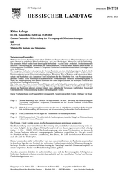 20. Wahlperiode Drucksache 20/2751 HESSISCHER LANDTAG 24. 02. 2021 Kleine Anfrage Dr. Dr. Rainer Rahn (AfD) vom 13.05.2020 Corona-Pandemie – Sicherstellung der Versorgung mit Schutzausrüstungen und Antwort Minister für Soziales und Integration Vorbemerkung Fragesteller: Während der Corona-Pandemie zeigte sich in Kliniken und Praxen, aber auch in Pflegeeinrichtungen ein ekla- tanter Mangel an einfachsten Schutzvorkehrungen – wie etwa Handschuhe, Mundschutz und Schutzkleidung. Die genannten Artikel werden heute überwiegend im Ausland – v.a. in China – produziert. Produktionsausfälle oder eine Unterbrechung der Lieferketten, die unterschiedlichste Ursachen haben können, führen schnell zu Lieferengpässen. Großhändler konnten in Arztpraxen bereits im Februar die erforderlichen Lieferungen nicht mehr durchführen. Der mangelnde Nachschub traf aufgrund der Corona-Pandemie auf einen deutlich gesteigerten Bedarf, da die genannten Schutzausrüstungen auch von Alten- und Pflegeeinrichtungen angefordert wurden, die diese norma- lerweise nicht oder nur in geringem Umfang benötigen. Hinzu kam, dass im Rahmen der Kontaktverbote Hand- schuhe und Mundschutz auch zunehmend von Unternehmen für ihre Mitarbeiter bzw. von Privatpersonen an- gefordert wurden. Trotz frühzeitiger Erkennbarkeit der Problematik und intensiven Bemühungen gelang es weder der Bundesregierung noch anderen Behörden über einen langen Zeitraum, die benötigten Artikel in dem erforderlichen Umfang bereitzustellen. Die Folge war, dass Ärzte in ihren Praxen Patienten nicht mehr behandeln konnten bzw. aufgrund fehlender Schutzausrüstung gezwungen waren, notwenige Behandlungen ohne diesen Schutz durchzuführen. Da sich Epi- demien und Pandemien jederzeit ereignen können, muss zukünftig die Versorgung von Kliniken, Praxen und Unternehmen mit Schutzausrüstung in jedem Fall sichergestellt werden. Diese Vorbemerkung des Fragestellers vorangestellt, beantworte ich die Kleine Anfrage wie folgt: Frage 1. Welche Behörde(n) bzw. Stelle(n) ist/sind zuständig für bzw. überwacht die Sicherstellung der Versorgung von Kliniken, Arztpraxen, Unternehmen mit der für eine Pandemie erforderlichen Schutzausrüstung? Frage 2. Sieht die Landesregierung Versäumnisse bei den unter 1. aufgeführten zuständigen Stellen hinsicht- lich der Sicherstellung der Versorgung mit Schutzausrüstung während der Corona-Pandemie? Frage 3. Falls 2. zutreffend: Worin liegen die Versäumnisse der zuständigen Stellen? Frage 4. Falls 2. unzutreffend: Wie erklärt sich die Landesregierung dann den Mangel an Schutzausrüstung während der Corona-Pandemie? Die Fragen 1 bis 4 werden wegen des Sachzusammenhangs gemeinsam beantwortet. Die Sicherstellung einer hinreichenden Bevorratung mit persönlicher Schutzausrüstung ist in ers- ter Linie Aufgabe der jeweiligen Arbeitgeber und wird von diesen eigenverantwortlich erledigt (siehe § 1 Abs. 1 HKHG 2011). Die Landesregierung sieht keine Versäumnisse bei diesen, da die Corona-Pandemie nicht mit vorangegangenen Pandemien vergleichbar ist. Dies gilt sowohl im Hinblick auf ihre weltweite Ausdehnung, ihre Dauer, die Zahl der infizierten Personen als auch die Zahl der Todesopfer. Hinzu kommt, dass nicht vorhersehbar war, dass das erste Zentrum der Pandemie ausgerechnet in dem Land lag, das den Großteil der weltweiten Produktion persönlicher Schutzausrüstung be- herbergt. Dies hat zu einem erheblichen Anstieg der Nachfrage innerhalb Chinas und zugleich zu einem temporären Ausfall von Produktionskapazitäten geführt. Aus den genannten Gründen ist nachvollziehbar, dass sich die Bevorratung der Arbeitgeber an bisherigen Pandemieverläufen orientiert hat und nicht auf den spezifischen Verlauf der Corona- Pandemie abgestimmt war. Eingegangen am 24. Februar 2021 · Bearbeitet am 24. Februar 2021 · Ausgegeben am 26. Februar 2021 Herstellung: Kanzlei des Hessischen Landtags · Postfach 3240 · 65022 Wiesbaden · www.Hessischer-Landtag.de