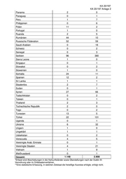 KA 20/197 KA 20/197 Anlage 2 Panama 2 0 Paraguay 0 1 Peru 1 7 Philippinen 0 6 Polen 11 2 Portugal 1 0 Ruanda 2 5 Rumänien 44 10 Russische Föderation 52 59 Saudi-Arabien 0 18 Schweiz 0 2 Senegal 0 3 Serbien 96 380 Sierra Leone 1 0 Singapur 0 1 Slowakei 0 2 Slowenien 1 0 Somalia 24 11 Spanien 12 2 Sri Lanka 1 1 Staatenlos 2 7 Sudan 0 1 Syrien 27 66 Tadschikistan 0 2 Taiwan 0 1 Thailand 2 3 Tschechische Republik 2 0 Togo 0 2 Tunesien 13 5 Türkei 22 101 Uganda 0 1 Ukraine 6 32 Ungarn 1 0 Ungeklärt 1 1 Usbekistan 0 2 Venezuela 4 5 Vereinigte Arab. Emirate 0 1 Vereinigte Staaten 4 21 Vietnam 1 9 Weißrussland 0 1 Gesamt: 1.148 2.908 *Erfasst sind Abschiebungen in die Herkunftsländer sowie Überstellungen nach der Dublin III- Verordnung oder im Drittstaatenverfahren **Eine statistische Erfassung, in welchen Zielstaat die freiwillige Ausreise erfolgte, erfolgt nicht.