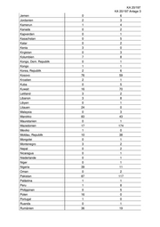 KA 20/197 KA 20/197 Anlage 3 Jemen 0 6 Jordanien 2 3 Kamerun 1 4 Kanada 0 2 Kapverden 0 1 Kasachstan 0 5 Katar 0 2 Kenia 3 0 Kirgistan 0 3 Kolumbien 7 8 Kongo, Dem. Republik 0 1 Kongo 1 1 Korea, Republik 2 6 Kosovo 76 59 Kroatien 2 1 Kuba 0 5 Kuwait 16 70 Lettland 3 2 Libanon 3 8 Libyen 0 1 Litauen 24 0 Malaysia 0 3 Marokko 83 43 Mauretanien 0 1 Mazedonien 17 174 Mexiko 1 0 Moldau, Republik 10 38 Mongolei 0 1 Montenegro 3 2 Nepal 0 2 Nicaragua 0 1 Niederlande 0 1 Niger 0 1 Nigeria 39 11 Oman 0 2 Pakistan 87 117 Palästina 1 1 Peru 1 8 Philippinen 0 5 Polen 16 0 Portugal 1 0 Ruanda 0 1 Rumänien 36 19