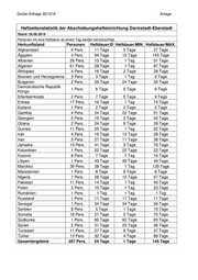 Große Anfrage 20/1218 Anlage Haftzeitenstatistik der Abschiebungshafteinrichtung Darmstadt-Eberstadt Stand: 28.06.2019 Personen mit eine Haftdauer ab einem Tag werden berücksichtigt. Herkunftsland Personen Haftdauer/Ø Haftdauer/MIN. Haftdauer/MAX. Afghanistan 9 Pers. 11 Tage 5 Tage 27 Tage Ägypten 3 Pers. 94 Tage 10 Tage 145 Tage Albanien 28 Pers. 10 Tage 1 Tag 31 Tage Algerien 61 Pers. 28 Tage 1 Tag 87 Tage Äthiopien 4 Pers. 16 Tage 2 Tage 39 Tage Bosnien und Herzegowina 3 Pers. 3 Tage 1 Tag 5 Tage Bulgarien 2 Pers. 29 Tage 24 Tage 34 Tage Demokratische Republik 1 Pers. 6 Tage 6 Tage 6 Tage Kongo Elfenbeinküste 2 Pers. 7 Tage 5 Tage 9 Tage Eritrea 17 Pers. 19 Tage 1 Tag 74 Tage Estland 1 Pers. 2 Tage 2 Tage 2 Tage Gambia 4 Pers. 34 Tage 22 Tage 51 Tage Georgien 5 Pers. 19 Tage 2 Tage 42 Tage Ghana 2 Pers. 24 Tage 8 Tage 39 Tage Guinea 11 Pers. 25 Tage 1 Tag 52 Tage Irak 4 Pers. 16 Tage 10 Tage 28 Tage Iran 3 Pers. 27 Tage 11 Tage 38 Tage Jamaika 10 Pers. 41 Tage 9 Tage 78 Tage Kolumbien 1 Pers. 22 Tage 22 Tage 22 Tage Kosovo 8 Pers. 7 Tage 1 Tag 16 Tage Libyen 1 Pers. 49 Tage 49 Tage 49 Tage Marokko 39 Pers. 38 Tage 1 Tag 135 Tage Mazedonien 1 Pers. 8 Tage 8 Tage 8 Tage Nigeria 7 Pers. 28 Tage 10 Tage 57 Tage Pakistan 11 Pers. 14 Tage 1 Tag 40 Tage Polen 3 Pers. 10 Tage 1 Tag 23 Tage Rumänien 1 Pers. 1 Tag 1 Tag 1 Tag Russland 1 Pers. 11 Tage 11 Tage 11 Tage Senegal 1 Pers. 34 Tage 34 Tage 34 Tage Serbien 8 Pers. 5 Tage 1 Tage 10 Tage Somalia 18 Pers. 21 Tage 5 Tage 70 Tage Südkorea 1 Pers. 60 Tage 60 Tage 60 Tage Syrien 2 Pers. 31 Tage 25 Tage 36 Tage Tunesien 11 Pers. 27 Tage 6 Tage 37 Tage Türkei 13 Pers. 32 Tage 4 Tage 89 Tage Gesamtergebnis 297 Pers. 24 Tage 1 Tage 145 Tage