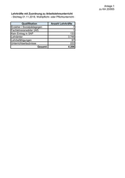 Anlage 1 zu KA 20/955 Lehrkräfte mit Zuordnung zu Arbeitslehreunterricht - Stichtag 01.11.2018, Wahlpflicht- oder Pflichtunterricht - Qualifikation Anzahl Lehrkräfte Erzieher / Sozialpädagogen 7 Fachlehreranwärter (Atf) 1 Kein Eintrag in SAP 133 Lehrämter 3.746 Lehrbefähigungen 97 Unterrichtserlaubnisse 222 Gesamt: 4.206