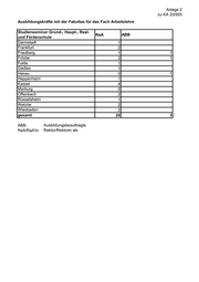 Anlage 2 zu KA 20/955 Ausbildungskräfte mit der Fakultas für das Fach Arbeitslehre Studienseminar Grund-, Haupt-, Real- RaA ABB und Förderschule Darmstadt 1 Frankfurt 2 Friedberg 1 1 Fritzlar 2 1 Fulda 1 Gießen 1 Hanau 0 1 Heppenheim 1 Kassel 4 Marburg 0 Offenbach 2 Rüsselsheim 1 Wetzlar 2 Wiesbaden 2 gesamt 20 3 ABB: Ausbildungsbeauftragte RaA/RaA'in: Rektor/Rektorin als