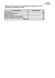 Anlage 3 zu KA 20/955 Öffentliche Schulen ohne Lehrkraft mit fachlicher Qualifikation im Fach Arbeitslehre zum Stichtag 01.10.2018 Schultypgruppe Anzahl Schulen Förderschulen 36 Grund-Haupt-Realschulen 22 Mittelstufenschule 1 Schulformbezogene Gesamtschulen 7 Schulformübergreifende Gesamtschulen 5 Gesamt: 71