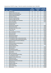 Antwortentwurf 20/3273_Anlage 1: Übersicht zusätzliche Intensivbetten Stand: 10.08.2020 Anzahl Intesivbetten, die Ausgezahlte genehmigter ausgezahlt Fördersummen VG Name_LR Intensivbetten wurden in € 1 _Klinikum Kassel 19 19 950.000 1 Agaplesion Diakonie-Kliniken Kassel 9 9 450.000 1 Asklepios Klinik Schwalmstadt/Melsungen 17 17 850.000 1 Asklepios Stadtklinik Bad Wildungen 12 12 600.000 1 DRK-Kliniken Nordhessen 20 20 1.000.000 1 Fachklinik für Lungenerkrankungen 4 4 200.000 1 Hospital zum Heiligen Geist Fritzlar 22 13 650.000 1 Klinik und Rehabilitationszentrum Lippoldsberg 9 9 450.000 1 Klinikum Werra-Meißner 18 18 900.000 1 Krankenhaus Bad Arolsen 5 0 0 1 Kreiskliniken Kassel 4 0 0 1 Kreiskrankenhaus Frankenberg 10 6 300.000 1 Marienkrankenhaus Kassel 6 6 300.000 1 Orthopädische Klinik Hessisch Lichtenau 11 11 550.000 1 Werner Wicker Klinik 24 24 1.200.000 2 _Klinikum Fulda 22 19 950.000 2 Herz- und Kreislaufzentrum Rotenburg 14 12 600.000 2 Klinikum Bad Hersfeld 30 15 750.000 2 Krankenhaus Eichhof 5 5 250.000 2 Kreiskrankenhaus Rotenburg 2 2 100.000 2 Kreiskrankenhaus Schotten 3 3 150.000 3 _Universitätsklinikum Gießen und Marburg Standort Gießen 39 39 1.950.000 3 _Universitätsklinikum Gießen und Marburg Standort Marburg 37 37 1.850.000 3 Agaplesion Evangelisches Krankenhaus Mittelhessen 27 27 1.350.000 3 Asklepios Klinik Lich 10 10 500.000 3 Asklepios Neurologische Klinik Bad Salzhausen 6 6 300.000 3 Capio Mathilden-Hospital 2 2 100.000 3 Diakonie-Krankenhaus Wehrda 3 0 0 3 Dill-Kliniken Dillenburg 4 4 200.000 3 DRK-Krankenhaus 6 6 300.000 3 Gesundheitszentrum Wetterau 9 9 450.000 3 Kaiserin-Auguste-Victoria-Krankenhaus 4 4 200.000 3 Kerckhoff-Klinik 30 30 1.500.000 3 Klinikum Wetzlar-Braunfels 17 17 850.000 3 St.-Josefs-Krankenhaus Balserische Stiftung 7 7 350.000 4 _Universitätsklinikum Frankfurt 20 20 1.000.000 4 Agaplesion Frankfurter Diakonie Kliniken 19 19 950.000 4 Asklepios Klinik Langen 18 18 900.000 4 Asklepios Klinik Seligenstadt 8 8 400.000 4 Bürgerhospital und Clementine-Kinderhospital 6 6 300.000 4 Hochtaunus-Kliniken 30 29 1.450.000 4 Hospital zum heiligen Geist 4 4 200.000 4 Ketteler Krankenhaus 3 3 150.000 4 Klinikum Frankfurt Höchst 48 48 2.400.000 4 Klinikum Hanau 12 12 600.000