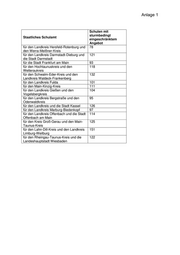 Anlage 1 Schulen mit sturmbedingt Staatliches Schulamt eingeschränktem Angebot für den Landkreis Hersfeld-Rotenburg und 78 den Werra-Meißner-Kreis für den Landkreis Darmstadt-Dieburg und 121 die Stadt Darmstadt für die Stadt Frankfurt am Main 93 für den Hochtaunuskreis und den 118 Wetteraukreis für den Schwalm-Eder-Kreis und den 132 Landkreis Waldeck-Frankenberg für den Landkreis Fulda 101 für den Main-Kinzig-Kreis 111 für den Landkreis Gießen und den 104 Vogelsbergkreis für den Landkreis Bergstraße und den 95 Odenwaldkreis für den Landkreis und die Stadt Kassel 126 für den Landkreis Marburg-Biedenkopf 97 für den Landkreis Offenbach und die Stadt 114 Offenbach am Main für den Kreis Groß-Gerau und den Main- 125 Taunus-Kreis für den Lahn-Dill-Kreis und den Landkreis 151 Limburg-Weilburg für den Rheingau-Taunus-Kreis und die 122 Landeshauptstadt Wiesbaden