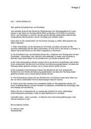 Anlage 2 EILT – SEHR DRINGLICH Sehr geehrte Schulleiterinnen und Schulleiter, nach aktueller Auskunft des Deutschen Wetterdienstes vom Samstagsabend ist in ganz Hessen in der Nacht von Sonntag (09.02.2020) auf Montag (10.02.2020) mit schweren Sturm- und Orkanböen zu rechnen, die den ganzen Montag insbesondere während des morgendlichen Berufsverkehrs und am Vormittag noch anhalten sollen. Daher bitte ich Sie nachdrücklich, für Ihre Schule Vorsorge zu treffen. Bitte beachten Sie dabei Folgendes: 1) Eltern entscheiden, ob der Schulweg für ihre Kinder zumutbar und sicher ist. Bei extremen Wetterlagen können Eltern entscheiden, ihr Kind nicht in die Schule zu schicken. In diesem Fall ist die Schule von den Eltern umgehend zu informieren. 2) Als Schulleiterin bzw. als Schulleiter können Sie – möglichst nach Rücksprache mit dem Schulträger – entscheiden, den Unterricht nicht stattfinden zu lassen oder frühzeitig zu beenden, damit keine Gefahr für die Schülerinnen und Schüler entstehen kann. a) Bei Unterrichtsausfall am Morgen müssen Sie für die dennoch eintreffenden oder bereits schon anwesenden Schülerinnen und Schüler eine Betreuung gewährleisten, bis diese den Heimweg wieder gefahrlos antreten und zu Hause betreut werden können. b) Bei vorzeitigem Unterrichtsende müssen Sie ebenfalls für die noch anwesenden Schülerinnen und Schüler die Betreuung gewährleisten, bis diese den Heimweg wieder gefahrlos antreten und zu Hause betreut werden können. 3) Ihre Entscheidung müssen Sie den Schülerinnen und Schülern sowie deren Eltern auf den von Ihnen verabredeten Kommunikationswegen bekannt machen. 4) Sofern durch das Unwetter eine unmittelbare Gefahr im Schulgebäude entsteht (z.B. durch umfallende Bäume, schwere Schäden an Gebäude), entscheidet der Schulträger über eine etwaige Schulschließung. Sollten Sie sich in Anbetracht der zu erwartenden Gefahren für einen vollständigen Unterrichtsausfall entscheiden, hielte ich diese Maßnahme für vertretbar. Lehrkräfte haben - sofern zumutbar - im Rahmen ihrer Unterrichtsverpflichtungen in der Schule anwesend zu sein. Mit freundlichen Grüßen Dr. Manuel Lösel Staatssekretär