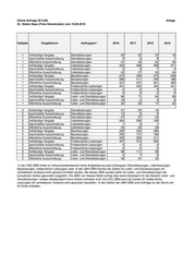 Kleine Anfrage 20/1246 Anlage Dr. Stefan Naas (Freie Demokraten) vom 19.09.2019 Halbjahr Vergabeform Auftragsart* 2016 2017 2018 2019 1 freihändige Vergabe Dienstleistungen 20 23 22 19 1 beschränkte Ausschreibung Dienstleistungen 9 8 8 7 1 öffentliche Ausschreibung Dienstleistungen 47 46 52 45 1 freihändige Vergabe Lieferleistungen 402 409 358 371 1 beschränkte Ausschreibung Lieferleistungen 2 5 7 5 1 öffentliche Ausschreibung Lieferleistungen 43 27 50 54 1 freihändige Vergabe Bauleistungen 272 246 270 249 1 beschränkte Ausschreibung Bauleistungen 286 311 246 188 1 öffentliche Ausschreibung Bauleistungen 527 427 361 465 1 freihändige Vergabe Freiberufliche Leistungen 431 530 424 431 1 beschränkte Ausschreibung Freiberufliche Leistungen 0 0 0 0 1 öffentliche Ausschreibung Freiberufliche Leistungen 0 0 0 0 1 freihändige Vergabe Liefer- und Dienstleistungen 96 71 94 96 1 beschränkte Ausschreibung Liefer- und Dienstleistungen 18 2 2 9 1 öffentliche Ausschreibung Liefer- und Dienstleistungen 22 32 17 22 2 freihändige Vergabe Dienstleistungen 31 22 18 2 beschränkte Ausschreibung Dienstleistungen 15 8 9 2 öffentliche Ausschreibung Dienstleistungen 27 27 23 2 freihändige Vergabe Lieferleistungen 564 558 169 2 beschränkte Ausschreibung Lieferleistungen 1 3 1 2 öffentliche Ausschreibung Lieferleistungen 33 23 28 2 freihändige Vergabe Bauleistungen 283 222 289 2 beschränkte Ausschreibung Bauleistungen 205 147 186 2 öffentliche Ausschreibung Bauleistungen 335 290 311 2 freihändige Vergabe Freiberufliche Leistungen 407 374 393 2 beschränkte Ausschreibung Freiberufliche Leistungen 0 0 0 2 öffentliche Ausschreibung Freiberufliche Leistungen 0 0 0 2 freihändige Vergabe Liefer- und Dienstleistungen 90 111 96 2 beschränkte Ausschreibung Liefer- und Dienstleistungen 2 7 9 2 öffentliche Ausschreibung Liefer- und Dienstleistungen 49 31 32 *In der HZD-ZBSt findet im Unterschwellenbereich keine Aufgliederung nach Auftragsart (Dienstleistungen, Lieferleistungen, Bauleistungen, freiberufliche Leistungen) statt. In der LBIH-ZBSt können die Zahlen für Liefer- und Dienstleistungen mit vertretbarem Aufwand nicht getrennt ermittelt werden. Bei diesen ZBSt wurden daher für Liefer- und Dienstleistungen die kumulierten Zahlen gesondert aufgeführt. Die ZBSt von Hessen Mobil verfügt über keine Datenbank für den Bereich Liefer- und Dienstleistungen, sodass diesbezüglich keine Zahlen enthalten sind. Die HCC-ZBSt kann die Zahlen für freiberufliche Leistungen mit vertretbarem Aufwand nicht gesondert darstellen. In den Zahlen der LBIH-ZBSt sind Aufträge für den Bund und für Dritte enthalten.
