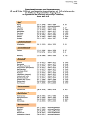 Kleine Anfrage 20/951 Anlage Zusatzbezeichnungen zum Gemeindenamen i.S. von § 13 Abs. 2 HGO, die vom Hessischen Innenministerium seit 1945 verliehen wurden (im Hinblick auf die geschichtliche Vergangenheit, die Eigenart oder die Bedeutung der jeweiligen Gemeinde) Stand: März 2019 „Bad“ i König (27.01.1948) StAnz. 1948 S. 53 Vilbel (28.04.1948) nicht veröffentlicht Hersfeld (16.02.1949) StAnz. 1949 S. 87 Endbach (11.10.1973) StAnz. 1973 S. 1883 Karlshafen (27.05.1977) StAnz. 1977 S. 1223 Camberg (27.08.1981) StAnz. 1981 S. 1865 Zwesten (21.08.1992) StAnz. 1992 S. 2134 Emstal (24.10.1992) StAnz. 1992 S. 2818 Arolsen (22.01.1997) StAnz. 1997 S. 490 „Landeshauptstadt“ Wiesbaden (24.12.1952) StAnz. 1953 S. 34 „Universitätsstadt“ Gießen (13.01.1959/ StAnz. 1959 S. 67 17.12.1979) StAnz. 1980 S. 6 Marburg (12.08.1966) StAnz. 1966 S. 132 „Kreisstadt“ Erbach (13.10.1977) StAnz. 1977 S. 2142 Eschwege (13.10.1977) StAnz. 1977 S. 2142 Friedberg (Hessen) (13.10.1977) StAnz. 1977 S. 2142 Heppenheim (Bergstraße) (13.10.1977) StAnz. 1977 S. 2142 Bad Hersfeld (13.10.1977) StAnz. 1977 S. 2142 Homberg (Efze) (13.10.1977) StAnz. 1977 S. 2142 Korbach (13.10.1977) StAnz. 1977 S. 2142 Lauterbach (Hessen) (13.10.1977) StAnz. 1977 S. 2142 Limburg a.d. Lahn (13.10.1977) StAnz. 1977 S. 2142 Bad Schwalbach (13.10.1977) StAnz. 1977 S. 2142 Hofheim am Taunus (07.11.1984) StAnz. 1984 S. 2314 Dietzenbach (24.03.2003) StAnz. 2003 S. 1483 Gelnhausen (15.11.2005) StAnz. 2005 S. 4510 „Barbarossastadt“ Gelnhausen (26.04.1978) StAnz. 1978 S. 923 ii „Marktflecken“ Weilmünster (30.09.1983) StAnz. 1983 S. 2002 Mengerskirchen (08.12.1995) StAnz. 1995 S. 4149 Villmar (24.05.2002) StAnz. 2002 S. 2070 Merenberg (11.02.2003) StAnz. 2003 S. 886 „Marktgemeinde“ Burghaun (07.11.2003) nicht veröffentlicht Eiterfeld (04.07.1995) nicht veröffentlicht Hilders (24.08.2016) nicht veröffentlicht Niederaula (19.08.2001) nicht veröffentlicht Philippsthal (Werra) (30.05.2001) nicht veröffentlicht