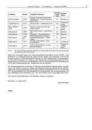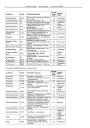 Hessischer Landtag · 20. Wahlperiode · Drucksache 20/2909 5 Bauzeit- Kreis Straße Projektbezeichnung Länge (km) ende Bau eines Radweges zwischen Amö- Marburg-Bie- L 3073 neburg (Brücker Mühle) und Stadtal- 1,6 2008 denkopf lendorf/Schweinsberg Bau eines Radweges zwischen Mar- Marburg-Bie- L 3090 burg/Bortshausen und Ebsdorfer- 1,5 2010 denkopf grund/Ebsdorf Bau eines Radweges zwischen Fron- Marburg-Bie- L 3048 hausen/Hassenhausen und Ebsdorfer- 3,1 2010 denkopf grund/Hachborn Bau eines Radweges zwischen Ebs- Marburg-Bie- L 3125 dorfergrund/Beltershausen und Mar- 1,7 2018 denkopf burg, 1.Bauabschnitt Bau eines Radweges zwischen Offenbach L 3117 1,1 2009 Obertshausen und Heusenstamm Bau eines Radweges zwischen Drei- Offenbach L 3317 3,4 2017 eich/Götzenhain und Neu-Isenburg Rheingau-Taunus- Bau eines Radweges zwischen Eltville L 3035 1,6 2008 Kreis und Kiedrich Bau eines Rad- und Gehweges bei Schwalm-Eder L 3214 0,3 2009 Fritzlar (Nord), 2. Bauabschnitt Bau eines Radweges zwischen Hes- Werra-Meißner- L 3238 sisch-Lichtenau/Walburg und Hes- 1,2 2013 Kreis sisch-Lichtenau/Velmeden Bau eines Radweges zwischen Hes- Werra-Meißner- L 3238 sisch-Lichtenau/Velmeden und Groß- 2,0 2018 Kreis almerode/Laudenbach Bau eines Radweges zwischen Li- Wetteraukreis L 3191 meshain/Hainchen und Alten- 1,8 2009 stadt/Lindheim Frage 4. Wie viele Radwege sind derzeit in Planung im Schwalm-Eder-Kreis? Die derzeit in Planung befindlichen Radwege an Landes- und Bundesstraßen können den nachfol- genden Tabellen entnommen werden. In Planung befindliche Radwege an Bundesstraßen: aktuelle aktuelle Landkreis Straße Projektbezeichnung Länge Phase (km) Heppenheim Ortsteil Kirschhausen - Bergstraße B 460 4,8 Vorentwurf Wald Erlenbach Anschlussstelle Darmstadt/Eberstadt Voruntersu- Darmstadt-Dieburg B3 0,4 – Eberstadt chung Münster/Altheim - Ortsdurchfahrt Darmstadt-Dieburg B 26 6,3 Vorentwurf Babenhausen entlang der B26 Darmstadt-Dieburg B 449 Querungshilfe bei Darmstadt R 8 0,3 Vorentwurf Fulda B 458 Radweg Fulda (L 3174) – Dipperz 1,3 Vorentwurf Rad-/Gehweg Gießen-Buseck/Op- Gießen B 49 5,9 Vorentwurf penrod Radweg Grünberg-Mücke/Flensun- Gießen B 49 4,5 Vorentwurf gen Rad-/Gehweg Ortsdurchfahrt Grün- Gießen B 49 1,1 Vorentwurf berg Frankfurter Str. - Wageninger Str. Groß-Gerau B 44 0,4 Vorentwurf bei Mörfelden Gernsheim, Knotenpunkt B 426/ Voruntersu- Groß-Gerau B 44 L 3112 (Pfungstädter Straße), 0,2 chung Anpassung Radweg Lückenschluss Rad- und Gehweg Groß - Gerau - Büttelborn Kappen- B 44 Voruntersu- Groß-Gerau verbreiterung A67 Überführung 1,1 B 42 chung B 42/B44 und B 44 Unterführung Taunusstraße Neubau eines Radweges zwischen Voruntersu- Groß-Gerau B 486 Mörfelden und der Anschlussstelle 1,3 chung Langen - Mörfelden - Lückenschluss
