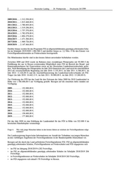 2 Hessischer Landtag · 20. Wahlperiode · Drucksache 20/1599 2009/2010: .... 1.312.550,00 €, 2010/2011: .... 1.815.468,00 €, 2011/2012: .... 1.780.855,00 €, 2012/2013: .... 1.519.296,00 €, 2013/2014: .... 1.757.570,00 €, 2014/2015: .... 1.782.078,00 €, 2015/2016: ... 1.894.279,00 €, 2016/2017: ... 1.471.500,00 €, 2017/2018: ... 1.969.726,00 €, 2018/2019: ... 2.147.464,00 €. Darüber hinaus werden für das Programm FSJ an allgemeinbildenden ganztägig arbeitenden Schu- len im Schuljahr 2019/2020 1.884.960 € und darüber hinaus ca. 2,2 Mio. € für den Einsatz von Freiwilligendienstleistenden an Förderschulen bereitgestellt. Die Mittelansätze hierfür sind in den letzten Jahren unverändert beibehalten worden. Zwischen 2008 und 2010 wurde im Rahmen eines zweijährigen Pilotprojekts mit 50.000 € die Einführung der nur in Hessen existierenden Möglichkeit eines FSJ im Bereich des Brand- und Katastrophenschutzes bei Feuerwehren sowie an der Hessischen Landesfeuerwehrschule geför- dert. Nach Beendigung des Pilotprojekts im Jahr 2010 finanzierte das Land noch bis einschließlich 2012 die wissenschaftliche Begleitung (im Jahr 2010: 3.153,50 €, im Jahr 2011: 6.366,00 €, im Jahr 2012: 11.424,00 €) und die Anschubfinanzierung des Landesfeuerwehrverbandes als FSJ- Träger (im Jahr 2010: 16.642,13 €, im Jahr 2011: 30.800,00 €, im Jahr 2012: 13.260,00 €). Zur Förderung des FÖJ hat das Land für den Zeitraum der Jahre 2009 bis 2019 Landesmittel in Höhe von 1.704.400,00 € zur Verfügung gestellt. Bezogen auf die einzelnen Jahre standen zur Verfügung: 2009: ............. 152.000,00 €, 2010: ............. 152.000,00 €, 2011: ............. 152.000,00 €, 2012: ............. 152.000,00 €, 2013: ............. 152.000,00 €, 2014: ............. 152.000,00 €, 2015: ............. 152.000,00 €, 2016: ............. 152.000,00 €, 2017: ............. 152.000,00 €, 2018: ............. 158.600,00 €, 2019: ............. 177.800,00 €. Für das Jahr 2020 ist eine Erhöhung der Landesmittel für das FÖJ in Höhe von 322.000 € im hessischen Haushaltsplan veranschlagt. Frage 4. Wie viele junge Menschen haben in den letzten Jahren an welchem der Freiwilligendienste teilge- nommen? Der Landesregierung liegen keine Informationen zur Anzahl der Teilnahme von jungen Menschen an den vielfältigen Angeboten der Freiwilligendienste in der Bundesrepublik Deutschland vor. Bezogen auf die durch das Land geförderten Freiwilligendienste FSJ, FSJ an allgemeinbildenden ganztägig arbeitenden Schulen, Freiwilligendienste an Förderschulen und FÖJ engagierten sich im FSJ im Jahrgang 2018/2019 6.202 Freiwillige, im FSJ an allgemeinbildenden ganztägig arbeitenden Schulen im Schuljahr 2018/2019 204 Freiwillige, in Freiwilligendiensten an Förderschulen im Schuljahr 2018/2019 265 Freiwillige, im FÖJ engagieren sich aktuell 170 Freiwillige in Hessen.