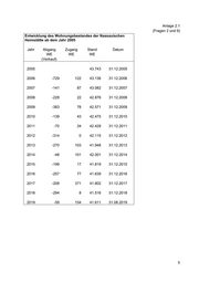 Anlage 2.1 (Fragen 2 und 9) Entwicklung des Wohnungsbestandes der Nassauischen Heimstätte ab dem Jahr 2005 Jahr Abgang Zugang Stand Datum WE WE WE (Verkauf) 2005 43.743 31.12.2005 2006 -729 122 43.136 31.12.2006 2007 -141 87 43.082 31.12.2007 2008 -228 22 42.876 31.12.2008 2009 -383 78 42.571 31.12.2009 2010 -139 43 42.475 31.12.2010 2011 -70 24 42.429 31.12.2011 2012 -314 0 42.115 31.12.2012 2013 -270 103 41.948 31.12.2013 2014 -48 101 42.001 31.12.2014 2015 -199 17 41.819 31.12.2015 2016 -257 77 41.639 31.12.2016 2017 -208 371 41.802 31.12.2017 2018 -294 8 41.516 31.12.2018 2019 -59 154 41.611 31.08.2019 5