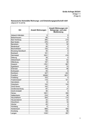 Große Anfrage 20/2341 Anlage 1.1 (Frage 2) Nassauische Heimstätte Wohnungs- und Entwicklungsgesellschaft mbH (Stand 07.10.2019) Anzahl Wohnungen mit Ort Anzahl Wohnungen Belegungs- und oder Mietbindung Alsbach-Hähnlein 5 5 Babenhausen 66 9 Bad Homburg 395 219 Bad Soden 476 97 Bensheim 76 32 Biedenkopf 26 0 Bischofsheim 120 72 Breuberg-Sandbach 30 0 Butzbach 181 0 Darmstadt 1631 416 Dieburg 39 0 Dietzenbach 62 62 Dillenburg 197 38 Dreieich 1761 587 Egelsbach 97 70 Erlensee 149 66 Erzhausen 45 0 Eschborn 327 222 Frankfurt 16328 5017 Friedberg 103 0 Friedrichsdorf 119 101 Gernsheim 8 8 Griesheim 144 144 Groß-Gerau 102 0 Großkrotzenburg 87 27 Groß-Umstadt 36 0 Hanau 1651 356 Hattersheim 216 36 Heuchelheim 204 114 Heusenstamm 32 32 Hirschhorn 28 16 Höchst 45 0 Homberg 6 0 Kelsterbach 689 458 Kronberg 139 66 Langen 1230 397 1