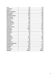 Lich 24 24 Liederbach 30 30 Maintal 435 114 Mainz-Amöneburg 24 24 Mainz-Kastel 268 236 Michelstadt 176 45 Mörfelden-Walldorf 301 159 Münzenberg 20 20 Neu-Isenburg 398 158 Nidderau 24 24 Ober-Mörlen 20 20 Ober-Ramstadt 206 67 Obertshausen 117 109 Oberursel 420 223 Oestrich-Winkel 123 87 Offenbach 2939 824 Pfungstadt 463 89 Raunheim 61 41 Rödermark 32 16 Rodgau 30 15 Rosbach 12 12 Rüdesheim 213 127 Rüsselsheim 464 456 Schöneck 34 34 Schotten 26 0 Schwalbach 1222 227 Seeheim-Jugenheim 63 0 Seligenstadt 463 123 Steinbach 481 114 Wetzlar 189 85 Wiesbaden 5445 2057 Gesamt 41.573 14.227 2