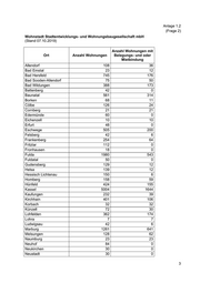 Anlage 1.2 (Frage 2) Wohnstadt Stadtentwicklungs- und Wohnungsbaugesellschaft mbH (Stand 07.10.2019) Anzahl Wohnungen mit Ort Anzahl Wohnungen Belegungs- und oder Mietbindung Allendorf 108 36 Bad Emstal 23 12 Bad Hersfeld 745 176 Bad Sooden-Allendorf 75 50 Bad Wildungen 388 173 Battenberg 42 0 Baunatal 561 314 Borken 68 11 Cölbe 126 24 Cornberg 21 21 Edermünde 60 0 Eichenzell 10 10 Erfurt 48 0 Eschwege 505 200 Felsberg 42 6 Frankenberg 254 64 Fritzlar 112 0 Fronhausen 18 0 Fulda 1980 543 Fuldatal 50 0 Gudensberg 129 12 Helsa 139 12 Hessisch Lichtenau 150 6 Homberg 158 59 Hünfeld 424 155 Kassel 5004 1644 Kaufungen 232 39 Kirchhain 401 106 Korbach 32 32 Künzell 72 30 Lohfelden 362 174 Lohra 7 7 Ludwigsau 42 6 Marburg 1261 641 Melsungen 128 62 Naumburg 23 23 Neuhof 84 0 Neukirchen 30 0 Neustadt 30 0 3