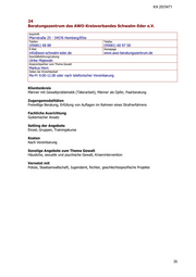 KA 20/3471 24 Beratungszentrum des AWO-Kreisverbandes Schwalm-Eder e.V. Anschrift Pfarrstraße 25 · 34576 Homberg/Efze Telefon Telefax (05681) 68 88 (05681) 60 97 58 E-Mail Homepage info@awo-schwalm-eder.de www.awo-beratungszentrum.de Geschäftsführung/Leitung Ulrike Majewski Ansprechpartner zum Thema Gewalt Markus Horn Zeiten der Erreichbarkeit Mo-Fr 9.00-12.00 oder nach telefonischer Vereinbarung Klientenkreis Männer mit Gewaltproblematik (Täterarbeit), Männer als Opfer, Paarberatung Zugangsmodalitäten Freiwillige Beratung, Erfüllung von Auflagen im Rahmen eines Strafverfahrens Fachliche Ausrichtung Systemischer Ansatz Setting der Angebote Einzel, Gruppen, Trainingskurse Kosten Nach Vereinbarung Sonstige Angebote zum Thema Gewalt Häusliche, sexuelle und psychische Gewalt, Krisenintervention Vernetzt mit Polizei, Staatsanwaltschaft, Jugendamt, Richter, geschlechtsspezifische Projekte 35