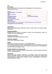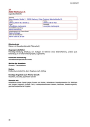 KA 20/3471 26 pro familia Deutsche Gesellschaft für Familienplanung, Sexualpädagogik und Sexualberatung e.V. Beratungszentrum Kassel Anschrift Breitscheidstraße 7 · 34119 Kassel Telefon (0561) 76 61 92 50 E-Mail Homepage kassel@profamilia.de www.profamilia.de/kassel Geschäftsführung/Leitung Petra Zimmermann Ansprechpartner zum Thema Gewalt Martin Plate Zeiten der Erreichbarkeit Mo 9.00-16.00 Uhr, Di-Fr 9.00-13.00 Uhr, Di 16.30-19.00 Uhr, Do 14.00-18.00 Uhr Beratungstermine nach Vereinbarung Klientenkreis Männer mit Gewaltproblematik (Täterarbeit), Männer als Opfer, Männer mit sonstigen Anliegen, Paarberatung Zugangsmodalitäten Freiwillige Beratung, Erfüllung von Auflagen im Rahmen eines Strafverfahrens, andere (z.B. Einbindung in ein Interventionsprojekt) Fachliche Ausrichtung Systemischer und verhaltenstherapeutischer Ansatz Setting der Angebote Einzel, Paare, Familiensysteme, Gruppen Kosten Tätergruppe pro Teilnehmer und Termin 1 % des Nettoeinkommens Nicht über KAIP (Interventionsprojekt), Staatsanwaltschaft oder Gericht Kommende zahlen 16 € für ein Erstgespräch-Einzel und 31 € für einen Folgetermin-Einzel oder 26 € für ein Erstgespräch- Paar und 41 € für einen Folgetermin-Paar Sonstige Angebote zum Thema Gewalt Häusliche, sexuelle und psychische Gewalt, Krisenintervention, Präventionsangebote insbesonde- re auch in der Behindertenhilfe Vernetzt mit Aktionsbündnis gegen Häusliche Gewalt Nord- und Osthessen, Runder Tisch Region Kassel, Netzwerk Täterarbeit Nordhessen, Landespräventionsrat Hessen, Arbeitsgruppe Täterarbeit des Landesverbandes pro familia Hessen, Behörden, Kliniken, niedergelassene TherapeutInnen, geschlechtsspezifische Projekte 37