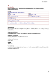 KA 20/3471 28 pro familia Deutsche Gesellschaft für Familienplanung, Sexualpädagogik und Sexualberatung e.V. Beratungsstelle Marburg Anschrift Frankfurter Straße 66 · 35037 Marburg Telefon Telefax (06421) 2 18 00 (06421) 16 41 79 E-Mail Homepage marburg@profamilia.de www.profamilia.de/marburg Geschäftsführung/Leitung Renate Reddemann Ansprechpartner zum Thema Gewalt Wolfgang Schreiner-Weiß Zeiten der Erreichbarkeit Mo-Do 9.00-13.00 Uhr und 15.00-18.00 Uhr, Fr 9.00-13.00 Uhr Klientenkreis Männer mit Gewaltproblematik (Täterarbeit), Männer als Opfer, Männer mit sonstigen Anliegen, Paarberatung Zugangsmodalitäten Freiwillige Beratung, Erfüllung von Auflagen im Rahmen eines Strafverfahrens Fachliche Ausrichtung Tiefenpsychologischer und systemischer Ansatz Setting der Angebote Einzel, Paare Kosten 10 bis 25 € Vernetzt mit Arbeitskreis Täterarbeit, pro familia Hessen, pro familia bundesweit, Behörden, Kliniken, nieder- gelassene TherapeutInnen 39