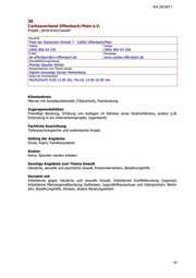 KA 20/3471 30 Caritasverband Offenbach/Main e.V. Projekt „Streit-Krise-Gewalt“ Anschrift Platz der Deutschen Einheit 7 · 63065 Offenbach/Main Telefon Telefax (069) 800 64 230 (069) 800 64 258 E-Mail Homepage eb-offenbach@cv-offenbach.de www.caritas-offenbach.de Geschäftsführung/Leitung Monika Stauder-Winter Ansprechpartner zum Thema Gewalt Diplom-Soziologe Günter Rothenberg Zeiten der Erreichbarkeit Mo/Di/Do/Fr 9.00-12.00 Uhr, Mo-Do 14.00-16.00 Uhr Klientenkreis Männer mit Gewaltproblematik (Täterarbeit), Paarberatung Zugangsmodalitäten Freiwillige Beratung, Erfüllung von Auflagen im Rahmen eines Strafverfahrens, andere (z.B. Einbindung in ein Interventionsprojekt, Jugendamt) Fachliche Ausrichtung Tiefenpsychologischer und systemischer Ansatz Setting der Angebote Einzel, Paare, Familiensysteme Kosten Keine, Spenden werden erbeten Sonstige Angebote zum Thema Gewalt Häusliche, sexuelle und psychische Gewalt, Krisenintervention, Bewährungshilfe Vernetzt mit Arbeitskreis gegen häusliche und sexuelle Gewalt, Arbeitskreis Konfliktberatung (regional), Arbeitskreis Männergewaltberatung Südhessen, Jugendhilfeausschuss und Vatergremien, Behör- den, Bewährungshilfe, Kliniken, andere Beratungsstellen 41