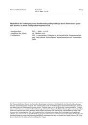 Wissenschaftliche Dienste Sachstand Seite 2 WD 2 - 3000 - 111/19 Möglichkeit der Verhängung eines Handelsembargos/Importstopps durch Deutschland gegen- über Staaten, in denen Zwangsarbeit eingesetzt wird Aktenzeichen: WD 2 - 3000 - 111/19 Abschluss der Arbeit: 10. Oktober 2019 Fachbereich: WD 2: Auswärtiges, Völkerrecht, wirtschaftliche Zusammenarbeit und Entwicklung, Verteidigung, Menschenrechte und humanitäre Hilfe Die Wissenschaftlichen Dienste des Deutschen Bundestages unterstützen die Mitglieder des Deutschen Bundestages bei ihrer mandatsbezogenen Tätigkeit. Ihre Arbeiten geben nicht die Auffassung des Deutschen Bundestages, eines sei- ner Organe oder der Bundestagsverwaltung wieder. Vielmehr liegen sie in der fachlichen Verantwortung der Verfasse- rinnen und Verfasser sowie der Fachbereichsleitung. Arbeiten der Wissenschaftlichen Dienste geben nur den zum Zeit- punkt der Erstellung des Textes aktuellen Stand wieder und stellen eine individuelle Auftragsarbeit für einen Abge- ordneten des Bundestages dar. Die Arbeiten können der Geheimschutzordnung des Bundestages unterliegende, ge- schützte oder andere nicht zur Veröffentlichung geeignete Informationen enthalten. Eine beabsichtigte Weitergabe oder Veröffentlichung ist vorab dem jeweiligen Fachbereich anzuzeigen und nur mit Angabe der Quelle zulässig. Der Fach- bereich berät über die dabei zu berücksichtigenden Fragen.