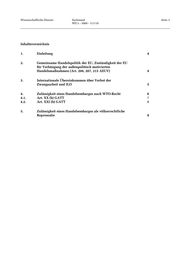 Wissenschaftliche Dienste Sachstand Seite 3 WD 2 - 3000 - 111/19 Inhaltsverzeichnis 1. Einleitung 4 2. Gemeinsame Handelspolitik der EU, Zuständigkeit der EU für Verhängung der außenpolitisch motivierten Handelsmaßnahmen (Art. 206, 207, 215 AEUV) 4 3. Internationale Übereinkommen über Verbot der Zwangsarbeit und ILO 5 4. Zulässigkeit eines Handelsembargos nach WTO-Recht 6 4.1. Art. XX (b) GATT 7 4.2. Art. XXI (b) GATT 8 5. Zulässigkeit eines Handelsembargos als völkerrechtliche Repressalie 8