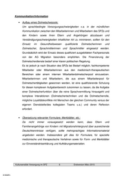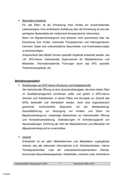 • Besondere Angebote Für alle Eltern ist die Erkrankung ihres Kindes ein einschneidendes Lebensereignis. Eine einfühlsame Aufklärung über die Erkrankung ist eine der wichtigsten Bestandteile der medizinisch-therapeutischen Intervention. Eltern mit Migrationshintergrund sind teilweise nicht ausreichend über die Erkrankung ihrer Kinder, eventuelle Therapieformen und Heilungschancen informiert. Dabei sind unterschiedliche Gesundheits- und Krankheitskonzepte zu berücksichtigen. Entsprechend dem Bedarf können spezielle Angebote entwickelt werden, wie z.B. SPZ-interne interkulturelle Supervisionen für Mitarbeiterinnen und Mitarbeiter, Informationsabende, Führungen durch das SPZ, spezielle Präventionsangebote, etc. Betriebsorganisation • Einwirkungen auf SPZ-interne Strukturen und Aufgabenprofile Die interkulturelle Öffnung ist eine Querschnittsaufgabe, die einen festen Platz im Qualitätsmanagement einnehmen sollte, und gehört in SPZ-interne Gremien und Arbeitskreise, in denen Pläne und Konzepte zur Zukunft des SPZs behandelt und thematisiert werden. Auch eine organisatorisch gesicherte, kontinuierliche Absprache mit der Betriebsleitung/ Geschäftsführung zur Versorgung von Kindern und Eltern mit Migrationshintergrund, notwendige Maßnahmen zur interkulturellen Öffnung und Kompetenzerweiterung, Veränderungen im Anforderungsprofil von Neueinstellungen, Erhöhung der Zahl der Mitarbeiterinnen und Mitarbeiter mit Migrationshintergrund ist unverzichtbar. • Intranet Erforderlich ist ein allen Mitarbeiterinnen und Mitarbeitern zugängliches Intranet, das alle relevanten Informationen (z.B. Dolmetscherlisten, interne Fremdsprachenliste, Liste der ambulanten/komplementären Dienste, kommunale Gesundheitswegweiser, Arbeitshilfen, nützliche Links, klinikinterne Kultursensible Versorgung im SPZ 7 Endversion März 2015 © DGSPJ