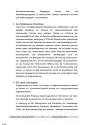 Informationsmaterialien, Fragebögen, interne Fort- und Weiterbildungsangebote zu interkulturellen Themen, übersetzte Formulare und Aufklärungsbögen, usw.) bereitstellt. • Aus-/Fortbildung und Weiterbildung Interne Fort- und Weiterbildung für Mitarbeiterinnen und Mitarbeiter: Außer der gezielten Einstellung von Personal mit Migrationshintergrund stellt interkulturelles Training einen wichtigen Beitrag zur Erhöhung der Kultursensibilität in der Arbeit mit Familien mit Migrationshintergrund und der migrantenfreundlichen Versorgung in SPZs dar. Deshalb sollten interkulturelle Themen als ein fester Bestandteil der internen Fort- und Weiterbildung in SPZ für Mitarbeiterinnen und Mitarbeiter angeboten werden. Besonders geschult werden sollten die Mitarbeiterinnen und Mitarbeiter, die im Kontakt mit den Eltern, Kindern und Familien stehen. Hierzu zählen neben den medizinischen, psychologischen und therapeutischen Berufsgruppen auch die Mitarbeiterinnen und Mitarbeiter der Verwaltung (Anmeldung, Telefonservice etc.). Gegebenenfalls ist es sinnvoll weitere Berufsgruppen mit einzubeziehen, um das Konzept der interkulturellen Öffnung über alle Funktionsebenen, Fachbereiche und in allen Berufsgruppen, die in der Einrichtung tätig sind, bekannt zu machen und alle MitarbeiterInnen hierfür zu sensibilisieren. Dies dient einer transparenten Vermittlung des Konzepts und sichert dadurch seine Akzeptanz und Implementierung. • SPZ-interne Dokumentation Solange wenig über Kinder und Familien mit Migrationshintergrund bekannt ist, können nur unzureichend Bedarfe ermittelt und Versorgungskonzepte angepasst werden. Die kontinuierliche Erhebung migrationsspezifischer Informationen und Daten sind unbedingte Voraussetzung, um Versorgungskonzepte zu entwickeln. In Anlehnung an die Stellungnahme und Empfehlung der Arbeitsgruppe Gesundheitsberichterstattung, Prävention, Rehabilitation, Sozialmedizin (AG GPRS) der Arbeitsgemeinschaft der obersten Landesgesundheitsbehörden Kultursensible Versorgung im SPZ 8 Endversion März 2015 © DGSPJ