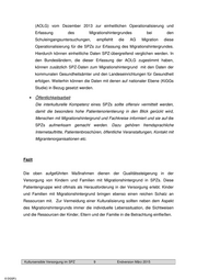 (AOLG) vom Dezember 2013 zur einheitlichen Operationalisierung und Erfassung des Migrationshintergrundes bei den Schuleingangsuntersuchungen, empfiehlt die AG Migration diese Operationalisierung für die SPZs zur Erfassung des Migrationshintergrundes. Hierdurch können einheitliche Daten SPZ-übergreifend verglichen werden. In den Bundesländern, die dieser Erfassung der AOLG zugestimmt haben, können zusätzlich SPZ-Daten zum Migrationshintergrund mit den Daten der kommunalen Gesundheitsämter und den Landeseinrichtungen für Gesundheit erfolgen. Weiterhin können die Daten mit denen auf nationaler Ebene (KiGGs Studie) in Bezug gesetzt werden. • Öffentlichkeitsarbeit Die interkulturelle Kompetenz eines SPZs sollte offensiv vermittelt werden, damit die besonders hohe Patientenorientierung in den Blick gerückt wird, Menschen mit Migrationshintergrund und Fachkreise informiert und sie auf die SPZs aufmerksam gemacht werden. Dazu gehören fremdsprachliche Internetauftritte, Patientenbroschüren, öffentliche Veranstaltungen, Kontakt mit Migrantenorganisationen etc. Fazit Die oben aufgeführten Maßnahmen dienen der Qualitätssteigerung in der Versorgung von Kindern und Familien mit Migrationshintergrund in SPZs. Diese Patientengruppe wird oftmals als Herausforderung in der Versorgung erlebt. Kinder und Familien mit Migrationshintergrund bringen ebenso einen reichen Schatz an Ressourcen mit. Zur Vermeidung einer Kulturalisierung sollten neben dem Aspekt des Migrationshintergrunds immer die individuelle Lebenssituation, die Sichtweisen und die Ressourcen der Kinder, Eltern und der Familie in die Betrachtung einfließen. Kultursensible Versorgung im SPZ 9 Endversion März 2015 © DGSPJ