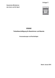 Anlage 5 Hessisches Ministerium des Innern und für Sport Infoblatt Teilzeitbeschäftigung für Beamtinnen und Beamte Voraussetzungen und Rechtsfolgen Stand: Januar 2019