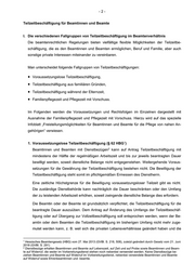 -3- Beschäftigten jetzt auf die volle Besoldung angewiesen sind. Dienstliche Belange dürfen nicht entgegenstehen. Dem Antrag auf Teilzeitbeschäftigung darf nur entsprochen werden, wenn die Beamtin oder der Beamte sich verpflichtet, während der Dauer der Teilzeitbeschäftigung außerhalb des Beamtenverhältnisses berufliche Verpflichtungen nur in dem Rahmen einzugehen, wie dies auch eine Vollzeitbeschäftigte oder ein Vollzeitbeschäftigter tun kann. 2. Teilzeitbeschäftigung aus familiären Gründen (§ 63 HBG) Diese Form der Teilzeitbeschäftigung können Beamtinnen oder Beamte in Anspruch neh- men, die mindestens ein Kind unter achtzehn Jahren oder einen pflegebedürftigen sonstigen Angehörigen tatsächlich betreuen oder pflegen. D.h. die Beamtin oder der Beamte muss ei- nen wesentlichen Teil der Betreuung oder Pflege selbst leisten. Angehörige im Sinne dieser Vorschrift sind Ehegatten, Lebenspartner, Partner einer eheähnlichen Lebensgemeinschaft, Verlob- te, Kinder, Enkel, Eltern, Großeltern, Kinder, Enkel, Eltern, Großeltern des Ehegatten, Geschwister, Kinder der Geschwister, Ehegatten und Lebenspartner der Geschwister und Geschwister der Ehegatten und Lebenspartner, Geschwister der Eltern, Pflegeeltern und Pflegekinder, 3 Pflegekinder des Ehegatten oder Lebenspartners. Die Pflegebedürftigkeit ist nachzuweisen. Dies kann durch Vorlage einer Bescheinigung der Pflegekasse, des Medizinischen Dienstes der Krankenversicherung, einer entsprechenden Bescheinigung einer privaten Pflegeversicherung oder eines ärztlichen Gutachtens erfolgen. a) Beamtinnen und Beamte mit Dienstbezügen Bei Vorliegen der genannten Voraussetzungen besteht für Beamtinnen und Beamte mit 2 Dienstbezügen ein Anspruch auf Bewilligung einer Teilzeitbeschäftigung mit mindestens 15 Stunden pro Woche, wenn zwingende dienstliche Belange nicht entgegenstehen. Eine Teilzeitbeschäftigung mit weniger als der Hälfte der regelmäßigen Arbeitszeit kann dabei für insgesamt höchstens 17 Jahre bewilligt werden. Beurlaubungen aus familiären oder beschäftigungspolitischen Gründen werden auf diese Höchstdauer angerechnet, nicht aber Teilzeitbeschäftigungen während der Elternzeit (§ 66 Abs. 1 HBG). 3 § 3 Abs. 4 HBG i.V.m. § 20 Abs. 5 HVwVfG
