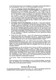 In der Rentenversicherung hat der Arbeitgeber für geringfügig entlohnte Beschäftigte ei- nen Pauschalbeitrag in Höhe von 15 v.H. des Arbeitsentgelts zu entrichten. ● Wurde die geringfügig entlohnte Beschäftigung nach dem 31. Dezember 2012 aufgenommen, besteht grundsätzlich Versicherungspflicht in der gesetzlichen Ren- tenversicherung. Da der Arbeitgeber nach § 168 Abs. 1 Nr. 1b SGB VI den Pau- schalbeitrag in Höhe von 15 v.H. des Arbeitsentgelts (§ 163 Abs. 8 SGB VI) trägt, ha- ben die Beschäftigten lediglich die Differenz zum allgemeinen Beitragssatz (2015: 18,7 v.H.; also 3,7 v.H.) bei einer Mindestbemessungsgrundlage von 175 Euro (§ 163 Abs. 8 SGB VI) zu tragen. D.h., wenn ein Arbeitsentgelt unterhalb eines Betrages von 175 Euro erzielt wird, werden die Pauschbeträge auf der Grundlage von 175 Euro er- rechnet. Beschäftigte können gegenüber dem Arbeitgeber schriftlich beantragen, auf die Versicherungspflicht zu verzichten (§ 6 Abs. 1b SGB VI). Dann entfällt der von den Beschäftigten zu zahlende Anteil. ● Geringfügig entlohnte Beschäftigungen, die vor dem 1. Januar 2013 aufgenom- men wurden, sind in der gesetzlichen Rentenversicherung grundsätzlich versiche- rungsfrei, solange das Arbeitsentgelt nicht 400 Euro übersteigt (§ 230 Abs. 8 SGB VI). Beschäftigte können jedoch jederzeit auf die Versicherungsfreiheit verzichten, in- dem dies dem Arbeitgeber gegenüber schriftlich erklärt wird. Der Verzicht gilt für die gesamte Dauer des Beschäftigungsverhältnisses (ebenso wie bei allen übrigen paral- lel ausgeübten geringfügigen Beschäftigungsverhältnissen) und kann nicht widerrufen werden. Machen Beschäftigte hiervon Gebrauch, müssen sie die Differenz zwischen den vom Arbeitgeber zu tragenden Pauschalbeitrag und dem gewöhnlichen Beitrag (s. Punkt zuvor) tragen. ● Erhöht sich bei einem vor dem 1. Januar 2013 aufgenommenen geringfügigen Be- schäftigungsverhältnis das Arbeitsentgelt nach dem 31. Dezember 2012 auf einen Betrag zwischen 400,01 Euro und 450 Euro werden Beschäftigte versicherungspflich- tig mit der Möglichkeit, sich von der Versicherungspflicht befreien zu lassen. Kurzfristig Beschäftigte (§ 8 Abs. 1 Nr. 2 SGB IV) sind in der Kranken-, Pflege- und Ar- beitslosenversicherung versicherungsfrei. Auch in der Rentenversicherung besteht unab- hängig vom Datum der Beschäftigungsaufnahme Versicherungsfreiheit (§ 5 Abs. 2 Nr. 1 SGB IV). Pauschale Beiträge werden weder vom Arbeitgeber noch von der oder dem Be- schäftigten abgeführt. Für Arbeitsentgelte von mehr als 450 Euro bis zur Grenze von 850 Euro wurde eine sog. Gleitzone (Progressionszone) eingeführt. In dieser unterliegen die Arbeitsentgelte der Beitragspflicht in allen Zweigen der Sozialversicherung. In dieser Gleitzone wird der Bei- tragsbemessung auf Beschäftigtenseite ein reduziertes beitragspflichtiges Arbeitsentgelt zugrunde gelegt. Beschäftigte können jedoch hierauf verzichten (Erklärung gegenüber dem Arbeitgeber) und den Beitrag zur Rentenversicherung entsprechend des tatsächli- chen Arbeitsentgelts zahlen. Somit werden in der Rentenversicherung Ansprüche erwor- ben, die dem tatsächlichen Arbeitsentgelt entsprechen. In der Kranken-, Pflege- und Arbeitslosenversicherung ist ein solcher Verzicht nicht mög- lich. Sowohl geringfügig entlohnte Beschäftigte als auch kurzfristig Beschäftigte und Beschäf- tigte in der Gleitzone sind in der gesetzlichen Unfallversicherung kraft Gesetzes gegen Arbeitsunfälle und Berufskrankheiten versichert. IV. Betriebliche Altersversorgung Für geringfügig Beschäftigte im Sinne des § 8 Abs. 1 Nr. 1 SGB IV (geringfügig entlohnte Be- schäftigte) besteht Versicherungspflicht in der betrieblichen Altersversorgung. - 11 -