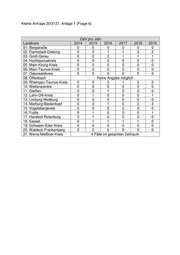 Kleine Anfrage 20/3127, Anlage 1 (Frage 6) Zahl pro Jahr Landkreis 2014 2015 2016 2017 2018 2019 01. Bergstraße 0 0 0 0 0 0 02. Darmstadt-Dieburg 0 0 1 1 3 2 03. Groß-Gerau 0 0 2 1 1 1 04. Hochtaunuskreis 0 0 0 0 0 0 05. Main-Kinzig-Kreis 0 0 0 0 0 0 06. Main-Taunus-Kreis 0 0 0 0 0 0 07. Odenwaldkreis 0 0 0 0 0 0 08. Offenbach Keine Angabe möglich 09. Rheingau-Taunus-Kreis 0 0 3 1 2 2 10. Wetteraukreis 0 0 0 0 0 0 11. Gießen 0 0 1 0 0 0 12. Lahn-Dill-Kreis 0 1 0 0 0 1 13. Limburg-Weilburg 0 0 0 0 0 0 14. Marburg-Biedenkopf 0 3 1 0 2 2 15. Vogelsbergkreis 0 0 0 0 0 0 16. Fulda 0 1 0 0 0 1 17. Hersfeld-Rotenburg 0 1 0 0 0 0 18. Kassel 0 1 1 1 1 0 19. Schwalm-Eder-Kreis 0 0 0 0 0 0 20. Waldeck-Frankenberg 0 0 0 0 0 0 21. Werra-Meißner-Kreis 4 Fälle im gesamten Zeitraum