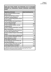 Anlage 1 zu KA 20/942 Anteil des Fachs Politik und Wirtschaft, der im Schuljahr 2018/2019 an öffentlichen Schulen fachfremd unterrichtet¹ wurde Staatliches Schulamt Anteil fachfremd [%] für den Hochtaunuskreis und den 12,9 Wetteraukreis für den Lahn-Dill-Kreis und den 30,8 Landkreis Limburg-Weilburg für den Landkreis Bergstraße und den 19,7 Odenwaldkreis für den Landkreis Darmstadt-Dieburg 22 und die Stadt Darmstadt für den Landkreis Fulda 26,6 für den Landkreis Gießen und den 23,6 Vogelsbergkreis für den Landkreis Groß-Gerau und den 19 Main-Taunus-Kreis für den Landkreis Hersfeld-Rotenburg 26,7 und den Werra-Meißner-Kreis für den Landkreis Kassel und die Stadt 27,4 Kassel für den Landkreis Marburg-Biedenkopf 23 für den Landkreis Offenbach und die 14,9 Stadt Offenbach am Main für den Main-Kinzig-Kreis 20,5 für den Rheingau-Taunus-Kreis und 15,5 die Stadt Wiesbaden für den Schwalm-Eder-Kreis und den 32,9 Landkreis Waldeck-Frankenberg für die Stadt Frankfurt am Main 18,1 ¹ in allgemeinen Schulformen der Sekundarstufe I sowie in der gymnasialen Oberstufe, inkl. berufliches Gymnasium als auch Schulen für Erwachsene;dabei wurden Pflicht-, Grund-, Leistungskurse und Wahlpflichtunterrichte berücksichtigt