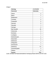 KA 20/1881 Anlage 1 Stichtag: 31.07.2019 Gemeinde Zahnärzte Alheim 2 Bebra 7 Breitenbach 1 Cornberg 0 Friedewald 0 Hauneck 0 Haunetal 1 Heringen 5 Bad Hersfeld 34 Hohenroda 0 Kirchheim 2 Ludwigsau 1 Nentershausen 2 Neuenstein 0 Niederaula 1 Philippsthal 3 Ronshausen 1 Rotenburg 7,5 Schenklengsfeld 3 Wildeck 4 Summe 74,5 Quelle: Schreiben der Kassenzahnärztlichen Vereinigung Hessen (KZVH) vom 30.01.2020