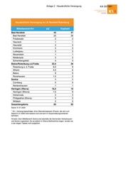 Anlage 2 - Hausärztliche Versorgung KA 20/1881 Hausärztliche Versorgung im LK Hersfeld-Rotenburg 1 Mittelbereich/Ort VA Kopfzahl Bad Hersfeld 43 47 Bad Hersfeld 22 26 Friedewald 2 2 Hauneck 1 1 Haunetal 4 4 Kirchheim 3 3 Ludwigsau 3 3 Neuenstein 1 1 Niederaula 3 3 Schenklengsfeld 4 4 Bebra/Rotenburg a.d.Fulda 22,5 26 Rotenburg a. d. Fulda 8,5 9 Alheim 4,5 6 Bebra 8 9 Ronshausen 1,5 2 Sontra 1 1 Cornberg 0 0 Nentershausen 1 1 Heringen (Werra) 16,5 19 Heringen (Werra) 7,5 9 Hohenroda 2 3 Philippsthal (Werra) 5 5 Wildeck 2 2 Gesamtergebnis 83 93 Stand: 01.01.2020 1 VA = Versorgungsaufträge; ohne Übernahmepraxen (Praxen, die sich zum Stand 01.01.2020 nicht besetzt sind und sich im Ausschreibungsverfahren befinden) Hinweis: Dem Mittelbereich Sontra sind ebenfalls die Gemeinden Herleshausen und Sontra zugeordnet. Da sie jedoch im Werra-MeißnerKreis liegen, wurden sie in der obigen Tabelle nicht aufgeführt.