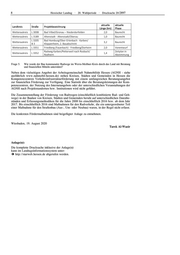 8 Hessischer Landtag · 20. Wahlperiode · Drucksache 20/2897 aktuelle aktuelle Landkreis Straße Projektbezeichnung Länge (km) Phase Wetteraukreis L 3008 Bad Vilbel/Gronau – Niederdorfelden 2,0 Baurecht Wetteraukreis L 3189 Altenstadt - Altenstadt/Oberau 1,0 Baurecht L 3205 Bad Homburg/Ober-Erlenbach - Karben/ Wetteraukreis 3,2 Baurecht B3 Kloppenheim, 2. Bauabschnitt Wetteraukreis L 3351 Friedberg (Fauerbach) - Friedberg/Dorheim 2,0 Vorentwurf Radweg Karben/Petterweil nach Rosbach/ Zeitplan in Wetteraukreis L 3352 1,4 Rodheim Abstimmung Frage 5. Wie wurde der Bau kommunaler Radwege im Werra-Meißner-Kreis durch das Land mit Beratung und finanziellen Mitteln unterstützt? Neben dem vielseitigen Angebot der Arbeitsgemeinschaft Nahmobilität Hessen (AGNH - siehe ausführlich www.nahmobil-hessen.de) stehen Kreisen, Städten und Gemeinden in Hessen die Kompetenzzentren Verkehrsinfrastrukturförderung mit einem umfangreichen Beratungsangebot zur finanziellen Förderung zur Verfügung. Eine Statistik über die Beratungsleistungen der Kom- petenzzentren, der Nutzung des Internetangebots oder der unterschiedlichen Veranstaltungen der AGNH nach Projektstandorten bzw. Institutionen wird nicht geführt. Die Zusammenstellung der Förderung von Radwegen (einschließlich kombinierte Rad- und Geh- wege) in der Baulast von Kreisen, Städten und Gemeinden beruht auf unterschiedlichen Datenbe- ständen und Erfassungsmethodiken für die Jahre 2008 bis einschließlich 2016 bzw. ab dem Jahr 2017. Bis einschließlich 2016 sind Maßnahmen für den Radverkehr, die ein untergeordneter Teil einer Maßnahme für den Straßenbau (Aus-, Um- oder Neubau) waren, in der Regel nicht erfasst. Die konkreten Fördermaßnahmen sind beigefügter Anlage zu entnehmen. Wiesbaden, 19. August 2020 Tarek Al-Wazir Anlage(n): Die komplette Drucksache inklusive der Anlage(n) kann im Landtagsinformationssystem unter: http://starweb.hessen.de abgerufen werden.
