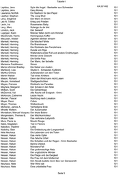 Tabelle1 KA 20/1492 Lapidus, Jens Spür die Angst - Bestseller aus Schweden 101 Lapidus, Jens Easy Money 101 Lawrence Norfolk Ein Nashorn für den Papst 101 Leather, Stephen The Long Shot 101 Lenz, Siegfried Der Mann im Strom 101 Leo N. Tolstoi Krieg und Frieden 101 Levin, Ira Rosemaries Baby 101 Levy, Marc Solange du da bist 101 London, Jack Der Seewolf 101 Luginger, Karin Männer fallen nicht vom Himmel 101 MacDonald, Harris Hemingways Koffer 101 MacLean, Alistair Agenten sterben einsam 101 Mankell, Henning Die falsche Fährte 101 Mankell, Henning Die Brandmauer 101 Mankell, Henning Die Rückkehr des Tanzlehrers 101 Mankell, Henning Hunde von Riga 101 Mankell, Henning Wallanders erster Fall und andere Erzählungen 101 Mankell, Henning Mörder ohne Gesicht 101 Mankell, Henning Die fünfte Frau 101 Mankell, Henning Der Mann, der lächelte 101 Marianne Fredriksson Simon 101 Marion Zimmer Bradley Die Nebel von Avalon 101 Marklund, Liza Studio 6 - Schweden Kultkrimi 101 Martha Grimes Auferstanden von den Toten 101 Martin Walser Tod eines Kritikers 101 Mason, Richard Denn der Wind kann nicht Lesen 101 Maupin, Armistead Stadtgeschichten 101 Mayes, Frances Rückkehr ins Paradies 101 Mayhew, Margaret Der Schatz in der Abtei 101 McBain, Scott Die Geheimloge 101 McDermid, Val Alle Rache will Ewigkeit - Krimi 101 McKenzie, Catherine Letzte Nacht 101 Mercier, Pascal Nachtzug nach Lissabon 101 Meyer, Deon Cobra 101 Meyer, Thomas Wolkenbruch 101 Michener, James A. Verheißene Erde 101 Minette Walters Der Außenseiter 101 Montalban, Manuel Vazquez Der letzte Bolero 101 Morgenstern, Thomas B. Der Milchkontrolleur 101 Mosse, Kate Das verlorene Labyrinth 101 Mure, Pierre la Moulin Rouge 101 Nabb, Magdalen Tod in Florenz 101 Nabokov, Vladimir Lolita 101 Nadolny, Sten Die Entdeckung der Langsamkeit 101 Nele Neuhaus Die Lebenden und die Toten 101 Nesser, Hakan Das vierte Opfer 101 Nesser, Hakan Das falsche Urteil 101 Nesser, Hakan Die Schatten und der Regen - Krimi Bestseller 101 Nesser, Hakan Barins Dreieck 101 Nesser, Hakan Münsters Fall 101 Nesser, Hakan Das grobmaschige Netz 101 Nesser, Hakan Der unglückliche Mörder 101 Nesser, Hakan Die Fliege und die Ewigkeit 101 Nesser, Hakan Die Frau mit dem Muttermal 101 Nesser, Hakan Kim Novak badete nie in See von Genezareth 101 Neuhaus, Nele Wer Wind sät 101 Neuhaus, Nele Eine unbeliebte Frau 101 Seite 5