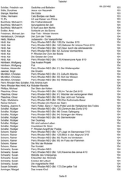Tabelle1 KA 20/1492 Schiller, Friedrich von Gedichte und Balladen 103 Sölle, Dorothee Jesus von Nazareth 103 Stange, Manfred Die Edda 103 Vinke, Hermann Cato Bontjes van Beek 103 Yi, Pu Ich war Kaiser von China 103 Buchholz, Michael H. Die Freihandelswelt 104 Buchholz, Michael H. Sprungsteine der Zeit 104 Buchholz, Michael H. Er kam aus dem Nichts 104 Endler, Arno Schlacht um die Sonne 104 Friedman, Michael Jan Star Trek - Wieder Vereint 104 Hardebusch, Christoph Der Zorn der Trolle 104 Heitz, Markus Judassohn - Ein Vampirthriller 104 Hirdt, Kai Perry Rhodan NEO (Bd. 128) De Verräter 8/10 104 Hirdt, Kai Perry Rhodan NEO (Bd. 122) Geboren für Arkons Thron 2/10 104 Hirdt, Kai Perry Rhodan NEO (Bd. 102) Spur durch die Jahrtausende 104 Hirdt, Kai Perry Rhodan NEO (Bd. 92) Auroras Vermächtnis 104 Hirdt, Kai P. Rhodan:Der Zorn der Bestie 104 Hirdt, Kai Die Geister der Crest 104 Hirdt, Kai Perry Rhodan NEO (Bd. 178) Kriesenzone Apas 8/10 104 Hohlbein, Wolfgang Das Avalon Projekt 104 Hohlbein, Wolfgang Flut 104 Huiskes, Alexander Perry Rhodan NEO (Bd. 21) Der Weltenspalter 104 Jaeckel, Birgit Die Druidin 104 Montillon, Christian Perry Rhodan NEO (Bd. 23) Zuflucht Atlantis 104 Montillon, Christian Perry Rhodan NEO (Bd. 30) Hort der Weisen 104 Montillon, Christian Perry Rhodan NEO (Bd. 93) Weltensaat 104 Perrx Rhodan Neo Schäfer, Rüdiger Als Andros kam 104 Perry Rhodan Neo Hirdt, Kai Roboter-Revolte 104 Phillips, Michael Der Stein der Kelten 104 Plaschka, Oliver Perry Rhodan NEO (Bd. 129) Im Tal der Zeit 9/10 104 Plaschka, Oliver Perry Rhodan NEO (Bd. 91) Wächter der verborgenen Welt 104 Plaschka, Oliver Perry Rhodan NEO (Bd. 85) Das Licht von Terrania 104 Puljic, Madeleine Perry Rhodan NEO (Bd. 155) Der Andromeda-Basar 104 Reiner Schorm Perry Rhodan (Im Reich der Naiir) 104 Rowling, Joanne K. Harry Potter, Band 7: Harry Potter und die Heiligtümer des Todes 104 Schäfer, Rüdiger Perry Rhodan NEO (Bd. 125) Zentrum des Zorns 5/10 104 Schäfer, Rüdiger Perry Rhodan NEO (Bd. 98) Crests Opfergang 104 Schäfer, Rüdiger Perry Rhodan NEO (Bd. 94) Schergen der Allianz 104 Schäfer, Rüdiger Perry Rhodan NEO (Bd. 86) Sternenkinder 104 Schäfer, Rüdiger Der Oxykrieg 104 Schäfer, Rüdiger Wir sind wahres Leben 104 Schäfer, Rüdiger Countdown für Siron 104 Schäfer, Rüdiger P. Rhodan:Angriff der Posbis 104 Schorm, Rainer Perry Rhodan NEO (Bd. 127) Jagd im Sternenmeer 7/10 104 Schorm, Rainer Perry Rhodan NEO (Bd. 123) Blick in den Abgrund 3/10 104 Schorm, Rainer Perry Rhodan NEO (Bd. 90) Flucht ins Verderben 104 Schorm, Rainer Perry Rhodan NEO (Bd. 95) Im Fluss der Flammen 104 Schorm, Rainer Die Wut der Roboter 104 Schorm, Rainer Der Kontakt 104 Schwartz, Susan Perry Rhodan NEO 104 Schwartz, Susan Perry Rhodan NEO (Bd. 124) Kaverne des Janus 4/10 104 Schwartz, Susan Melodie des Untergangs 104 Schwartz, Susan Erleuchter des Himmels 104 Schwartz, Susan Exodus der Liduuri 104 Schwartz, Susan Die magnetische Welt 104 Susan Schwartz Perry Rhodan NEO (Bd. 172) Der gelbe Tod 104 Arminger, Marget Das innere Kind 105 Seite 8