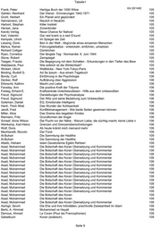 Tabelle1 KA 20/1492 Unbekannt Hebräisches Gebetbuch - Schabbat 110 Unbekannt Hebräisches Gebetbuch - Schabbat 110 Unbekannt Hebräisches Gebetbuch - Schabbat 110 Unbekannt Hebräisches Gebetbuch - Siddur-Schma Kolenu 110 Unbekannt Hebräisches Gebetbuch - Siddur Sephat Emeth 110 Brinkel, Wolfgang Dem Leben auf der Spur 111 Busch, Wilhelm Isus: destinul nostru 111 Büsing, Antje Auf den Spuren der Weisheit 111 Georg Popp Die Großen des Glaubens 111 Kresina, Ante Bibel (kroatisch) Novi Zavjet Psalmi 111 Page, Nick Der falsche Messias, die wahre Geschichte von Jesus von Nazareth 111 Peuster, Marianne Gott spricht in meinen Tag 111 Zahrnt, Heinz Warum ich glaube 111 Weiß, E.R Gedanken von Buddha 112 Calle Hesslefors Zeitgeschichte - Frankfurt 200 Cesky Raj Josef Prosek - Bildband 200 Hirmer, Albert Die Zeit der frühen Herzöge - Von Otto I. zu Ludwig dem Bayern 200 Hirmer, Albert Um Glauben und Reich - Kurfürst Maximilian der I. 200 Jost Schilgen So schön ist HESSEN 200 Oldrich Karasek Panorama Praha 200 Topp Die Kunst des Zeichnens 200 Dahl, Roald Ich sehe was, was Du nicht siehst 201 Diederichs, Ulf Der Märchenpalast 201 Dietl, Erhard Die Witzerakete 201 Disney, Walt Der Autoklau geht um, Comic 201 Ellen Berg Ich schenk dir die Hölle auf Erden 201 von Hirschhausen, Eckart Die Leber wächst mit ihren Aufgaben 201 Berman, Morris Wiederverzauberung der Welt 303 Beruf Aktuell Lexikon der Ausbildungsberufe 303 Bormans, Leo Glück 303 Busek, Albert Arnold Schwarzenegger - Bodybuilding für Männer 303 Fuchs, Walter R. Denkspiele vom Reißbrett 303 Heller, Klaus Fallschirm Springern 303 Hoffmann, Bernt Handbuch des autogenen Traininigs 303 Irwin, Yukiko Mit 10 Fingern gegen 1000 Krankheiten 303 Jantsch, Erich Die Selbstorganisation des Universums - Vom Urknall zum menschlichen Geist 303 Krauss, Meinold Ich habe einen Traum - Visionen und Wirklichkeiten 303 Lanchester, John Die Sprache des Geldes 303 Lindemann, Dr. med. HannesAutogenes Training 303 Schwarzenegger, Arnold Bodybuilding für Männer - Das perfekte Programm für Körper- und Muskeltraining 303 Sinhuber, Brigitte Hauptsache von Herzen 303 Unzicker, Wolfgang Knaurs Neues Schachbuch 303 Däniken, Erich von Habe ich mich geirrt? 403 Haape, Johannes Südafrika 403 Christoph, Hans Die Scheidung von San Domingo 404 Dieter Kronzucker USA - Auf neuen Wegen durch die Neue Welt 405 von Horizont zu Horizont Australien - Englisch/Deutsch 405 Geo Themenlexikon Unsere Erde A - Irak 407 Aurora-Kunstverlag LeningradDer Goldene Ring 408 Kerkeling, Hape Ich bin dann mal weg 409 Kerkeling, Hape Ich bin dann mal weg 409 Buch und Zeit Verlagsgesellschaft m Lexikon Grosses 507 Ogger, Günter Nieten in Nadelstreifen 801 Ogger, Günter Das Kartell... 801 Archer, Geoffrey The Burma Legacy 1101 Baldacci, David Divine Justice 1101 Brandall Wallace Braveheart 1101 Seite 14