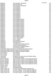 Tabelle1 KA 20/1492 Gebetbuch Koran (arabisch - französisch) 109 Gebetbuch Der Koran (deutsch) 109 Gebetbuch Koran (arabisch - französisch) 109 Gebetbuch Koran (arabisch) 109 Gebetbuch Koran (arabisch) 109 Gebetbuch Koran (arabisch) 109 Gebetbuch Koran (arabisch) 109 Gebetbuch Koran (arabisch) 109 Gebetbuch Koran (arabisch) 109 Gebetbuch Koran (arabisch) 109 Gebetbuch Koran (arabisch) 109 Gebetbuch Koran (arabisch) 109 Gebetbuch Koran (arabisch) 109 Gebetbuch Koran (arabisch-türkisch) 109 Gebetbuch Koran (arabisch-türkisch) 109 Gebetbuch Koran (arabisch-türkisch) 109 Gebetbuch Koran (arabisch-türkisch) 109 Gebetbuch Koran (arabisch-türkisch) 109 Gebetbuch Koran (arabisch-türkisch) 109 Gebetbuch Koran (arabisch-türkisch) 109 Gebetbuch Koran (arabisch-türkisch) 109 Gebetbuch Koran (arabisch-türkisch) 109 Gebetbuch Koran (arabisch-türkisch) 109 Gebetbuch Koran (arabisch-türkisch) 109 Gebetbuch Koran (arabisch-türkisch) 109 Gebetbuch Koran (arabisch-türkisch) 109 Gebetbuch Koran (arabisch-türkisch) 109 Gebetbuch Koran (arabisch-türkisch) 109 Gebetbuch Koran - Serbokroatisch 109 Gebetbuch Koran - Russisch 109 Gebetbuch Koran (arabisch) 109 Gebetsbuch Koran (bosnisch-serbisch) 109 Gebetsbuch The Noble Quran 109 Gebetsbuch The Noble Quran (arabisch-englisch) 109 Gebetsbuch Kuran-I Karim Meali (türkisch) 109 Gebetsbuch The Noble Quran (arabisch-englisch) 109 Gebetsbuch Kuran-i Kerim in (türkisch) 109 Hadhrat Mirza, Masroor Ahmad Koran: Der Heilige Koran (deutsch-arabisch) 109 Hadhrat Mirza, Masroor Ahmad Der Heilige Koran (deutsch-arabisch) 109 Hadhrat Mirza, Masroor Ahmad Der Heilige Koran (deutsch-arabisch) 109 Koran Arabisch Koran Arabisch 109 Koran Kurdisch Koran Kurdisch 109 Koran Kurdisch Koran Kurdisch 109 Lings, Martin Muhammad: sein Leben nach den frühesten Quellen 109 Lings, Martin Hz. Muhammedìn Hayati 109 Monschi, Nasrollah Kalila und Dimna: Fabeln aus dem klassischen Persien 109 Monschi, Nasrollah Kalila und Dimna: Fabeln aus dem klassischen Persien 109 Monschi, Nasrollah Kalila und Dimna: Fabeln aus dem klassischen Persien 109 Monschi, Nasrollah Kalila und Dimna: Fabeln aus dem klassischen Persien 109 Monschi, Nasrollah Kalila und Dimna: Fabeln aus dem klassischen Persien 109 Sofouglu, Cemal Büyük Dua Kitabi 109 Sofouglu, Cemal Büyük Dua Kitabi 109 Tavasli, Yusuf Dini Hikayeler Kitabi 109 Topbas, Osman Nuri Der Islam, Innere Wirklichkeit und äußere Form 109 Topbas, Osman Nuri Ein Krug voll Wasser - Aus den Gärten des Mathnawi 109 Topbas, Osman Nuri Ein Krug voll Wasser - Aus den Gärten des Mathnawi 109 Topbas, Osman Nuri Ein Krug voll Wasser - Aus den Gärten des Mathnawi 109 Seite 12