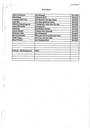 69 60A Dann bleib ich eben sitzen Steffens, Thorsten SchulproblemeKA 20/1492 70 60B Stress nicht so rum, ich find schon ´nen Job Wasserfall, Kurt Berufsfindung 71 61 Abgehauen Weber, Annette Waisen, familiäre Gewalt, Heim 72 62 Im Netz gewinn ich jeden Fight Kaster, Armin Computerspielsucht, Internet 73 63 Du bist doch nur zugekifft Hänel, Wolfram Drogen 74 64 Liebe ist was für Idioten. Wie mich. Schoder, Sabine Drogen, Tod, Liebe, Familie 75 65 Zeit der Wunder Boundox, Anne-Laure Flüchtlinge, Drama 76 66 Was ist denn schon dabei? unbekannt Gewalt, Schule 77 67 Elfte Woche Fehér, Christine Schwangerschaft 78 68 Knallhart Tessnow, Gregor Drogen, Dealen 79 69 Dschihad Calling Linker, Christian Salafismus 80 70 Drachenläufer Hosseini, Khaled Afghanistan 81 70A Tausend strahlende Sonnen Hosseini, Khaled Afghanistan 82 70B Traumsammler Hosseini, Khaled Afghanistan 83 71 Homevideo Kaci, Karin Mobbing 84 72 Miese Opfer Matthes, Silas Mobbing, Gewalt, Schule 85 73 Tigermilch de Velasco, Stefanie Mädchen - Großstadtjugend 86 74 Was ist los mit meinem Körper? Raith-Paula, Elisabeth Aufklärungsbuch für Mädchen 87 75 Die ersten drei Jahre meines Kindes Gehbauer-Sesterhenn Kleinkindentwicklung 88 76 Meine Schwangerschaft Höfer, Silvia Sachbuch Schwangerschaft 89 77 Ich bleib so scheiße wie ich bin Niazi-Shahabi, Rebecca Ratgeber, Selbstbewusstsein 90 78 Flucht aus Lager 14 Harden, Blaine Biografie, Arbeitslager 91 79 Eltern werden BzgA Ratgeber 92 80 Knastkinder Bertram, Rüdiger Haft Philippinen 93 81 Die Welle Rhue, Morton Macht, Psychologie 94 81A Die Welle - Buch zum Film Winter, Kersin Macht, Psychologie 95 82 Schloss aus Glas Walls, Jeannette Obdachlosigkeit Das Scheißleben meines Vaters, das Scheißleben 83 Altmann, Andreas Familie, Kindheit, Misshandlungen 96 meiner Mutter und meine eigene Scheißjugend 97 84 Zurück aus der Hölle Bisley, Sascha Haft, Biografie 98 85 Dann mach ich eben Schluss Fehér, Christine Suizid, Trauer 99 86 Gute Nacht, Zuckerpüppchen Hassenmüller, Heidi sexueller Missbrauch 100 87 So etwas wie Familie Chazal, Pierre Familie, Vaterschaft 101 88 Elefanten sieht man nicht Kreller, Susan Gewalt in der Familie 102 89 Die Haft - ein Leben in Angst und Schrecken Gertler, Nico Haft, Gefängnis 103 90 Tausend kleine Scherben Frey, James Drogensucht, Entzug 104 91 Die Welt wär besser ohne dich Littman, Sarah Mobbing, soziale Medien 105 92 Die hohe Kunst, unterm Radar zu bleiben Nielsen/Max Trauma, Außenseiter 106 93 American Rap Kage, Jan Geschichte der Rapmusik 107 94 Odem - On The Run Deppe, Jürgen Graffiti 108 95 Radikal Frey, Jana Neonazis 109 96 Cold Turkey Mechtel, Angelika Drogenentzug, Biographie 110 97 Ghetto Kidz Rhue, Morton Sozialer Brennpunkt 111 98 No place, no home Rhue, Morton Sozialer Abstieg 112 99 Asphalt Tribe Rhue, Morton Leben auf der Straße, Drogen 113 100 Über uns Stille Rhue, Morton Atomkrieg 114 100A American Hero Rhue, Morton 115 101 Fame Junkies Rhue, Morton Ruhm 116 102 Vincent, 17 Fehér, Christine Vaterschaft 117 103 Das Tagebuch der Anne Frank Frank, Anne NS-Zeit, Biographie 118 104 Im Bus ganz hinten Fler Biographie, Rap/Hip Hop 119 105 Exit Sugartown Petersen, Martin Flüchtlinge, Drama 120 106 Arabqueen Balci, Güner Yasemin Kultur, Emanzipation 121 107 Das Mädchen und der Gotteskrieger Balci, Güner Yasemin IS. Dschihad 122 108 Lieber schlau als blau Lindenmeyer, Johannes Alkohol- und Medikamentensucht 123 109 Komm, ich erzähl dir eine Geschichte Bucay, Jorge Märchen 124 110 Prost, Mathilda! Szillat, Antje Alkoholmissbrauch im Jugendalter 125 111 Hau ab, du Flasche Ladiges, Ann Alkoholmissbrauch im Jugendalter 126 112 Greg´s Tagebuch 1 Kinney, Jeff Humor, Comic, Schule 127 113 Greg´s Tagebuch 2 Kinney, Jeff Humor, Comic, Schule 128 114 Greg`s Tagebuch 3 Kinney, Jeff Humor, Comic, Schule 129 115 Greg´s Tagebuch 4 Kinney, Jeff Humor, Comic, Schule 130 116 Der Koran Glaube, Islam 131 117 Warrior Cats 1 Hunter, Erin Fantasy 132 118 Warrior Cats 2 Hunter, Erin Fantasy 133 119 Warrior Cats 3 Hunter, Erin Fantasy 134 120 Warrior Cats 4 Hunter, Erin Fantasy 135 121 Warrior Cats 5 Hunter, Erin Fantasy 136 122 Warrior Cats 6 Hunter, Erin Fantasy 137 123 Harry Potter 1 Rowling, J.K. Fantasy 138 124 Harry Potter 2 Rowling, J.K. Fantasy 139 125 Harry Potter 3 Rowling, J.K. Fantasy