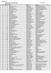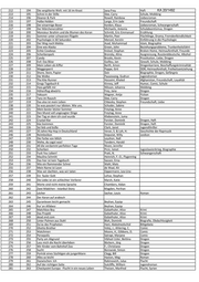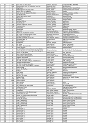 Anlage 7 Bücherliste JAE Gelnhausen KA 20/1492 Stand: 11/2019 Nr. fortlf. Buch- Nr. Titel AutorIn Kategorie 1 1 In der Hand der Piraten Fritsche, Olaf Abenteuer (Kinderbuch) 2 2 Windmähne Heuck, Sigrid Abenteuer, Verlust des Vaters 3 3 Die Mitte der Welt Steinhöfel, Andreas Außenseiter, (Homo-)Sexualität 4 4 Die ohne Segen sind Van Camp, Richard Außenseiter, Liebe (Native People) 5 5 Nennt mich nicht Ismael Bauer, Michael Außenseiter, Mobbing 6 6 Tote Tulpen Konecny, Jaromir Bewährung 7 7 Das Lächeln der Leere Höpfner, Anna Biografie, Essstörung 8 8 Türken Sam Gülay, Cem Biografie, Migration 9 9 Arabboy Balci, Güner Yasemin Biografie, Migration 10 10 Dis wo ich herkomm Deluxe, Samy Biografie, Migration 11 11 Das Spinnennetz Roth, Joseph Deutsche Literaturklassiker 12 12 Der Vater eines Mörders Andersch, Alfred Deutsche Literaturklassiker 13 13 Wenn ich will, hör ich auf Färber, Werner Drogenmissbrauch 14 14 Die Einbahnstraße Kordon, Klaus Drogensucht 15 15 No Exit Marshall, Daniel Grey Drogensucht, Gewalt, Familie 16 16 Erst frisst sie dich auf… Michl, Janina Essstörung 17 17 Es ist ein Elch entsprungen Steinhöfel, Andreas Familie (Elterntrennung) 18 18 Max in den Wolken Fessel, Karen-Susan Familie (Selbstmord des Vaters) 19 19 Wiebke und Paul Fuchs, Ursula Familie (Suchtproblematik) 20 20 Der Schatten meines Bruders Avery, Tom Familie (Tod des Bruders) 21 21 Die Ameisensiedlung Günter, Mirijam Familie, Drogensucht 22 22 Angela´s Ashes McCourt, Frank fremdsprachige Literatur 23 22A The Valley of Fear Conan Doyle, Arthur Kriminalroman 24 22B The Sign of four Conan Doyle, Arthur Kriminalroman 25 23 Der Kick Veiel, Andres Gewalt 26 24 Ich knall euch ab Rhue, Morton Gewalt, Amok, Außenseiter 27 25 Kein Wort zu niemandem Frey, Jana Gewalt, falsche Freunde 28 26 American Youth LaMarche, Phil Gewalt, Gruppendynamik 29 27 Gedisst Höra, Daniel Gewalt, Mobbing 30 28 Mit 18 mein Sturz Simsek, Mihrali Haft 31 28A Dann bin ich seelenruhig S., Angela Selbstverletzung, Borderline 32 29 Boot Camp Rhue, Morton Freiheitsentziehung 33 29A Boot Camp auf englisch Rhue, Morton Freiheitsentziehung 34 30 TKKG - X7 antwortet nicht Wolf, Stefan Jugendkrimi 35 30A Die drei ??? Und der Super-Papagei Die drei ??? Jugendkrimi 36 30B Die drei ??? Schwarze Madonna Die drei ??? Jugendkrimi 37 31 Schattenspieler Römling, Michael Jugendkrimi (Ende des 2. WK) 38 32 Blackout Gabathuler, Alice Jugendkrimi (Gewalt, Drogen) 39 33 Feind ohne Gesicht Verleyen, Karel Jugendkrimi (Überwachungsstaat) 40 34 Rockstar Superstar Nelson, Blake Jugendromam, Liebe 41 35 Die Wahrheit, wie Delly sie sieht Hannigan, Katherine Jugendroman 42 36 Das Blubbern von Glück Jonsberg, Barry Jugendroman 43 37 Darling Hartmann, Hanna Krimi (Frankfurt) 44 38 Wir sind eure Töchter, nicht eure Ehre Cileli, Serap Kultur 45 39 Der junge im gestreiften Pyjama Boyne, John NS-Zeit 46 40 Lauf, Junge, lauf Orlev, Uri NS-Zeit 47 41 Straßenblues Feher, Christine Obdachlosigkeit 48 42 Das Reich der Tränen Wilk, Janine Phantasie 49 43 Der Junge mit dem Herz aus Holz Boyne, John Phantasie, Familie (Krankheit) 50 44 Der mechanische Prinz Steinhöfel, Andreas Phantasie, Selbstreflexion 51 45 Todesschütze Rose, Malcolm Sci-Fi 52 46 Aufstand der Geister Schreiner, Andreas Sci-Fi 53 47 Doing It Burgess, Melvin Sexualität 54 48 Tschick Herrndorf, Wolfgang Spätaussiedler, Migration 55 49 Der Chronist der Winde Mankell, Henning Straßenkinder Afrikas, Gewalt 56 50 Dönerröschen Konecny, Jaromir Vorurteile, Migration 57 51 Die Krokodilbande in geheimer Mission Ahner, Dirk Abenteuer (Kinderbuch) 58 52 Zebrawald Gewirtz, Adina Rishe Familie 59 53 Mädchenmeute Fuchs, Kirsten Jugendroman (Mädchen, Abenteuer) 60 54 Die Beschissenheit der Dinge Verhulst, Dimitri Biographie (Roman, Unterschicht) 61 55 Davids Versprechen Bauscherus, J. 62 56 Abgestürzt Kaufmann, Marie Verlust der Eltern, Drogensucht 63 56A Heute schießen wir uns mal wieder richtig ab! Weber, Annette Alkoholmissbrauch im Jugendalter 64 57 Aber ich bin doch selbst noch ein Kind Weber, Annette Schwangerschaft 65 58 Verletzt Weber, Annette Selbstverletzung, Drogensucht 66 59 Verurteilt Weber, Annette Kriminalität, Haft 67 59A Abgeschoben Samiri, Djamal Biografie, Flucht 68 60 Merkt doch keiner, wenn ich schwänze Weber, Annette Schulverweigerung