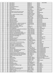 140 126 Harry Potter 4 Rowling, J.K. Fantasy KA 20/1492 141 127 Harry Potter 5 Rowling, J.K. Fantasy 142 128 Harry Potter 6 Rowling, J.K. Fantasy 143 129 Harry Potter 7 Rowling, J.K. Fantasy 144 130 A Thousand Splendid Suns Hosseini, Khaled Roman 145 131 Tatort Hanau Grünewald/Kögel Lokalkrimi 146 132 Greg´s Tagebuch 5 Kinney, Jeff Humor, Comic, Schule 147 133 Ein Schatten wie ein Leopard Levoy, Myron Ghetto, Gewalt 148 134 Freak Philbrick, Rodman Freundschaft 149 135 Letztendlich sind wir dem Universum egal Levithan, David Roman 150 136 Mein Herz und andere schwarze Löcher Warga, Jasmine Liebesgeschichte 151 137 Easy Wortberg, Christoph Familie 152 138 Check - Aufstehen, Überleben, Schlafen… Wiedlich, Johannes Drogensucht 153 139 Kaputte Suppe Valentine, Jenny Liebesgeschichte 154 140 Dschihad Online Rhue, Morton Radikaler Glaube 155 141 Gangsta Oma Walliams, David Gangsterkomödie 156 142 Es war einmal Aleppo Benkau, Jennifer Roman, Gesellschaft, Flüchtlinge 157 143 Wörterbuch Arabisch Langenscheidt Sprache lernen 158 144 Wörterbuch Englisch Langenscheidt Sprache lernen 159 145 Wörterbuch Französisch Langenscheidt Sprache lernen 160 145A Wörterbuch Persisch Langenscheidt Sprache lernen 161 146 Visuelles Wörterbuch - deutsch als Fremdsprache Dorling Kindersley deutsch als Fremdsprache 162 146A Visuelles Wörterbuch - arabisch - deutsch Dorling Kindersley deutsch als Fremdsprache 163 146B Bildwörterbuch - arabisch - deutsch PONS deutsch als Fremdsprache 164 146C Deutsch als Fremdsprache - Bild für Bild Langenscheidt deutsch als Fremdsprache 165 147 Die Sammlung der Hadithe Al-Buhari Islam, Glaube 166 148 Der Teejunge Kasim Heyn, Abu Bakr Islam, Erzählung, Syrien 167 149 Ein Krug voll Wasser aus den Gärten des Mathnawi Topbas, Osman Nuri Islam, Türkei, Poesie 168 150 Das Geheimnis der Gottesliebe Topbas, Osman Nuri Islam, Glaube 169 151 Tropfen vom Wasser des Lebens Topbas, Osman Nuri Islam, Erzählungen 170 152 Muhammad - Szenen aus seinem Leben Topbas, Osman Nuri Islam, Glaube 171 153 Der Islam - Innere Wirklichkeit und äußere Form Topbas, Osman Nuri Islam, Glaube 172 154 Die besten Geschichten Nasreddin Hodscha Hoca'dan, Nasreddin Islam, Erzählungen 173 155 Über Intention, reine Absicht und… Al-Ghazali Islam, Glaube 174 156 Das Elixier der Glückseligkeit Al-Ghasali Islam, Glaube 175 157 Ramadan Adil, Amina Islam, Glaube, Ramadan 176 158 Der Islam in Deutschland Rohe, Mathias Islam, Geschichte 177 159 Das islamische Recht Rohe, Mathias Islam, Recht und Gesetz 178 160 Einfluß des Islam auf das europäische Mittelalter Montgomery Watt, W. Islam, Historie 179 161 West-oestlicher Divan von Goethe, Johann W. Islam, Poesie 180 162 Die Kultur der Ambiguität - Eine andere Geschichte des Islams Bauer, Thomas Islam, Wissenschaft 181 163 Dein Wille Geschehe - Die schönsten islamischen Gebete Schimmel, Annemarie Islam, Gebete 182 164 Fabeln aus dem klassischen Persien Monschi, Nasrollah Islam, Erzählungen 183 165 Die Propheten - von Adam bis Jesus Adil, Amina Islam, Geschichte 184 166 Die Propheten - Sayyidina Muhammad Adil, Amina Islam, Geschichte 185 167 Muhammad - Sein Leben nach den frühesten Quellen Lings, Martin Islam, Geschichte 186 168 1001 Inventions Al-Hassani, Salim T. S. Islam, Geschichte, Englischsprachig 187 169 The Study Quran Nasr, Seyyed Hossein Islam, Koranübersetzung 188 170 Der Koran - Übersetzung von Friedrich Rückert Rückert, Friedrich (Übers.) Islam, Koranübersetzung 189 171 Der Koran - vollständige Ausgabe Henning Max (Übers.) Islam, Koranübersetzung 190 172 Der Koran - Neu übertragen Bobzin, Hartmut (Übers.) Islam, Koranübersetzung 191 173 Die Botschaft des Koran - Übersetzung & Kommentar Asad, Muhammad (Übers.) Islam, Koranübersetzung 192 174 Handbuch Christentum & Islam in Deutschland I Rohe, Mathias u.a. Islam und Christentum 193 175 Handbuch Christentum & Islam in Deutschland II Rohe, Mathias u.a. Islam und Christentum 194 176 Die 13 1/2 Leben des Käpt´n Blaubär Moers, Walter Roman, Russischsprachig 195 177 Dogboy Hornung, Eva Roman, Drama, Russischsprachig 196 178 Nichts ist okay! Reynolds J., Kiely, B. Rassismus, Vorurteile 197 179 Tschik auf arabisch Herrndorf, Wolfgang Spätaussiedler, Migration, Abenteuer 198 180 No way out Gabathuler, Alice Thriller 199 181 Stark ohne Stoff Ausfelder, Trude Drogen, Ratgeber 200 182 Darkly dreaming Dexter Lindsay, Jeff Thriller 201 183 Der Koran Henning Max (Übers.) Islam 202 184 Die Wabe der Liebe Erol, S. Mübarek Islam, Glaube 203 185 Zwei Blumen der Liebe Bilmen, Ömer Nasuhi Islam, Glaube 204 186 Frauenfragen zu besonderen Tagen Hayd, Nifas, Istihadah Islam, Aufklärung 205 187 Der Islam Dr. Selvi, Dilaver Islam, Glaube 206 188 Halal und Haram Asutay, Hasip Islam, Brauchtum 207 189 Muhammed – Das Siegel des Propheten Nalbant, Mehmet Islam, Glaube 208 190 Wegweiser für den neuen Muslim Weiger, Ali Ishan Islam, Glaube 209 191 Die Pforte der Reue Önlüer, Siraceddin Islam, Glaube 210 192 Aqideh – Die Glaubensgrundsätze der Elhu Sunneh welOkur, Dschema´ah Hüseyin Islam, Glaube 211 193 Basiswissen Islam Dr. Selvi, Dilaver Islam, Glaube